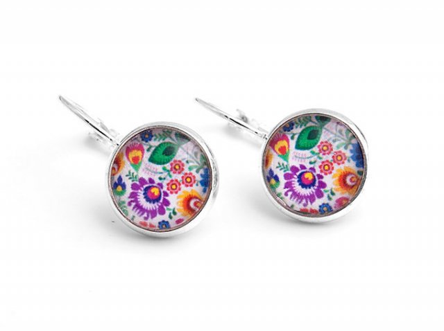 Ręcznie robione kolczyki wiszące z wysokiej jakości grafiką pokrytą wypukłym, powiększającym szkiełkiem. Kolczyki składają się z: