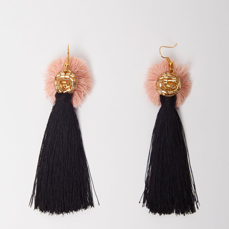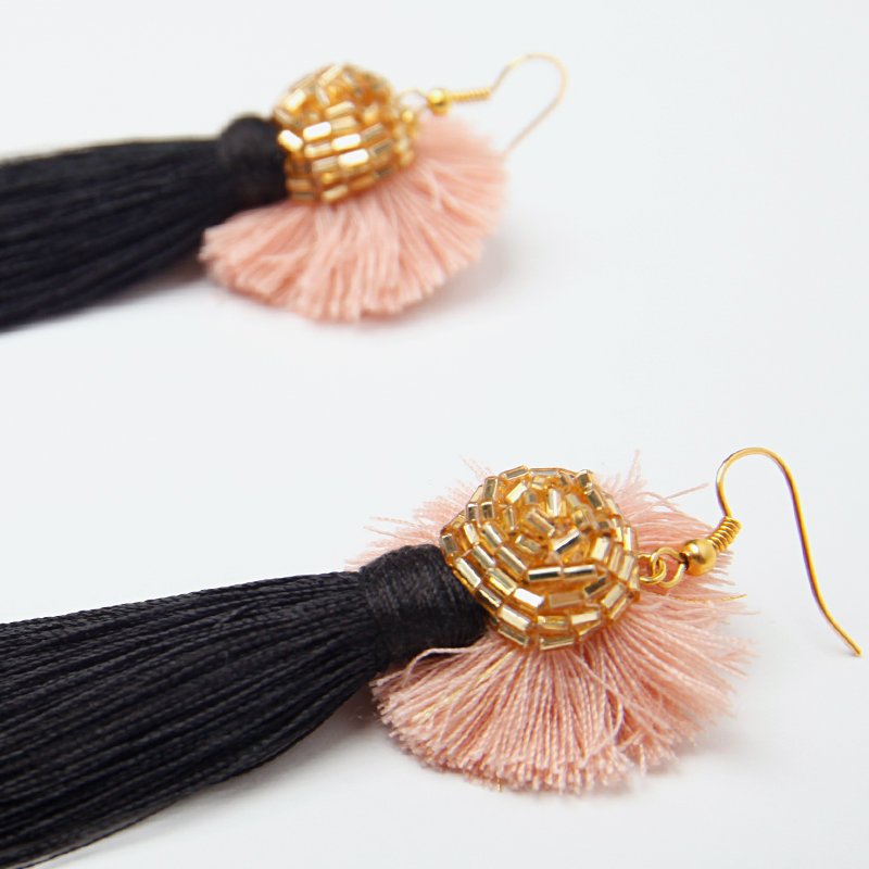 Ciekawe, wiszące kolczyki z czarnymi chwostami w stylu glamour. Chwost zwieńczony złotymi koralikami i pół-pomponem w kolorze pudrowego różu. Lewa strona równie, atrakcyjna co prawa, można przełożyć bigle i nosić na lewej. Mocowanie na antyalergicznym biglu, w razie potrzeby można bez problemu wymienić na stop szlachetny.