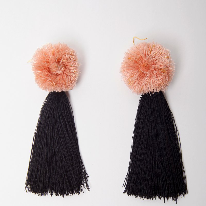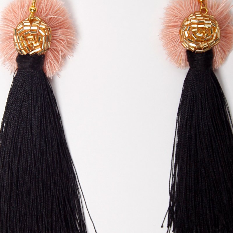 Ciekawe, wiszące kolczyki z czarnymi chwostami w stylu glamour. Chwost zwieńczony złotymi koralikami i pół-pomponem w kolorze pudrowego różu. Lewa strona równie, atrakcyjna co prawa, można przełożyć bigle i nosić na lewej. Mocowanie na antyalergicznym biglu, w razie potrzeby można bez problemu wymienić na stop szlachetny.