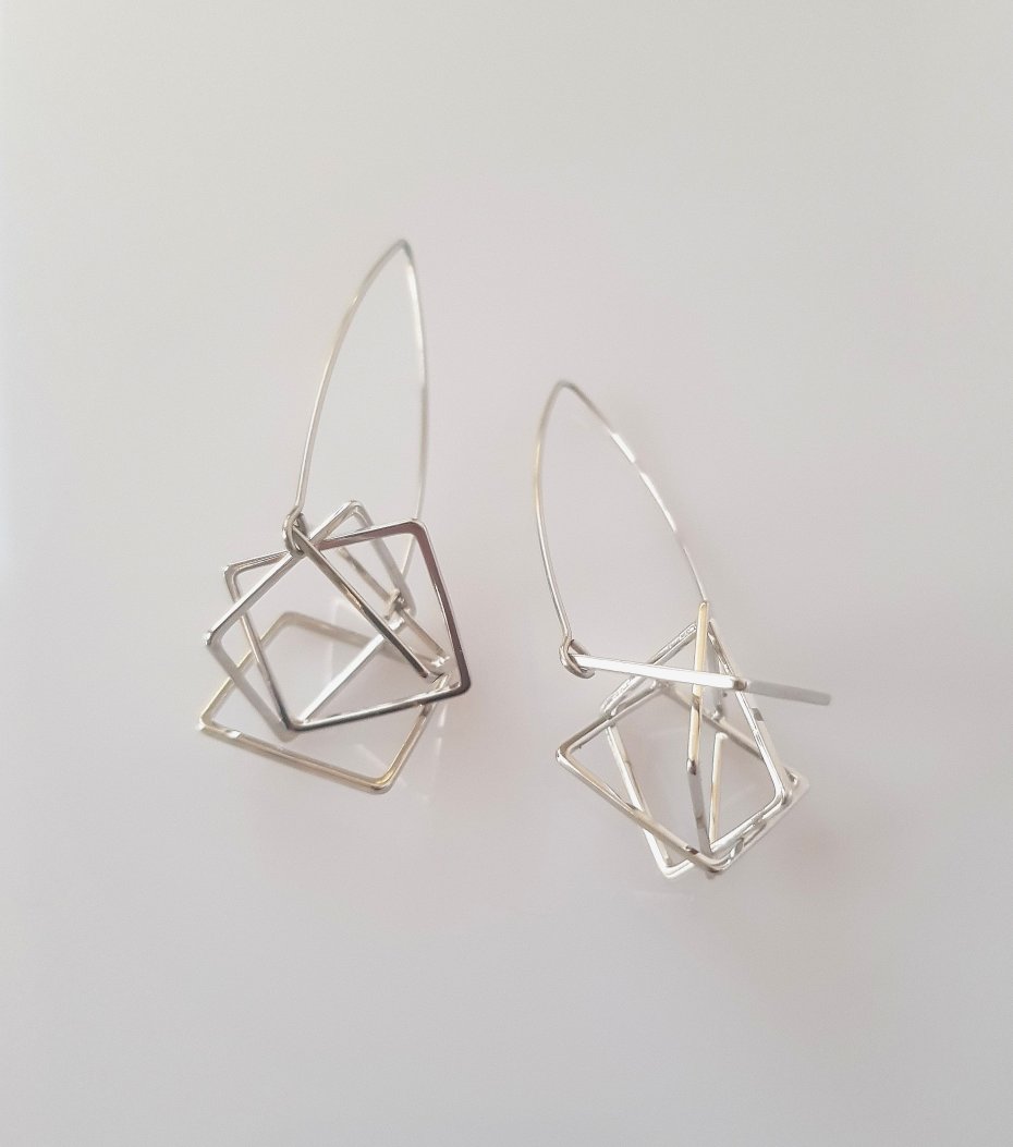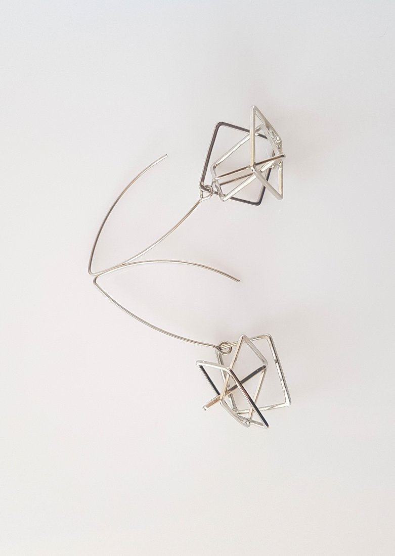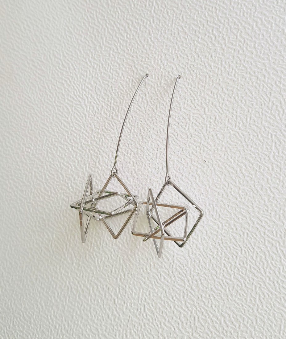 Geometryczne, długie kolczyki wykonane z mosiądzu platerowanego rodem.