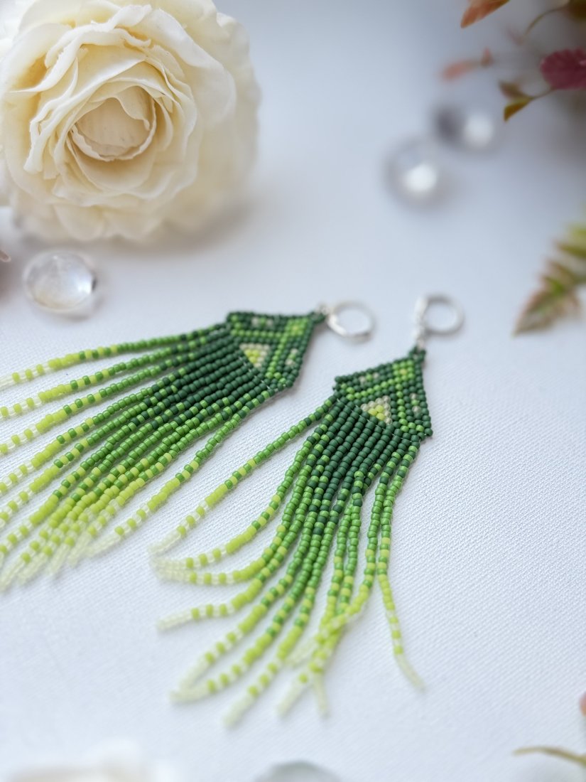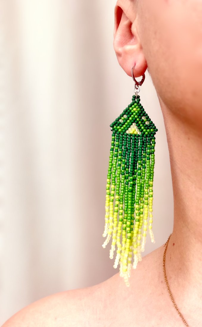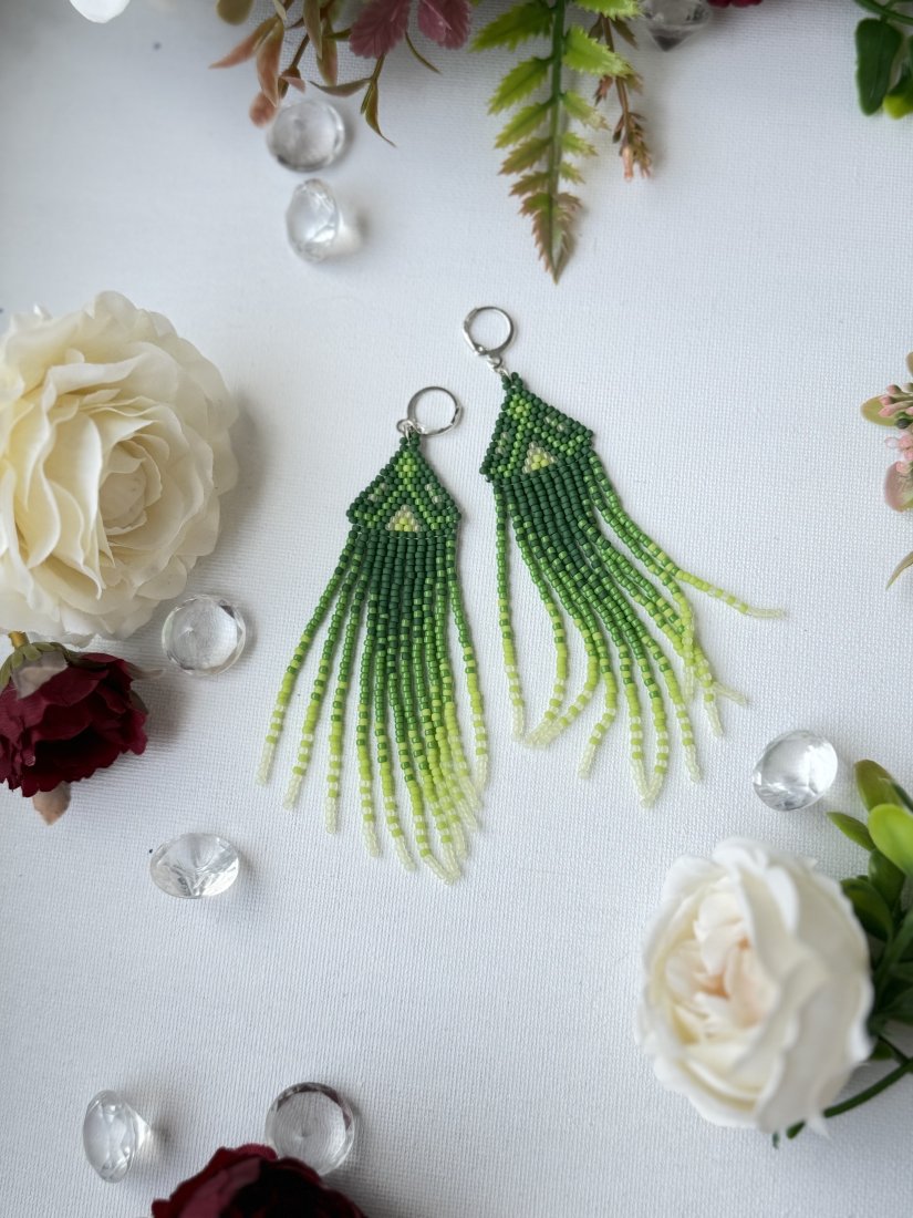 Te kolczyki są wykonane techniką **haftu koralikowego (beading)**. Mają **geometryczny, trójkątny kształt**, który jest urozmaicony długimi, zwisającymi frędzlami z koralików. Kolorystyka opiera się na **gradientowym przejściu odcieni zieleni** – od ciemnej do jasnej, co nadaje im subtelnego, naturalnego charakteru.