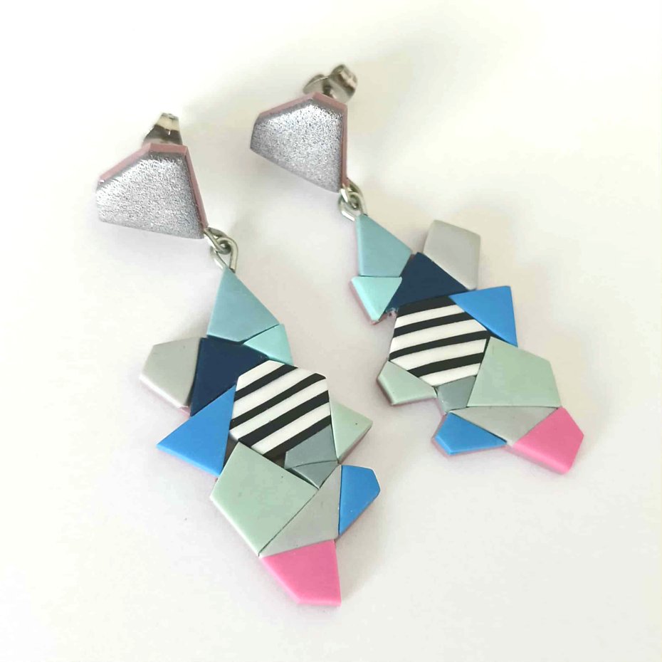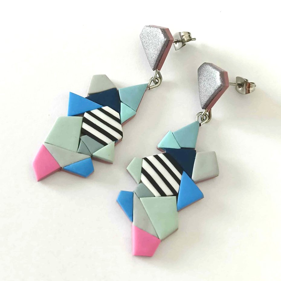 Ręcznie robione kolczyki z masy polimerowej w geometrycznym stylu. Połączenie pastelowego różu i błękitu z kontrastowym czarno-białym wzorem tworzy nowoczesny, artystyczny akcent do każdej stylizacji. Lekkie, wygodne i unikatowe – idealne dla osób, które lubią wyróżniać się dodatkami.