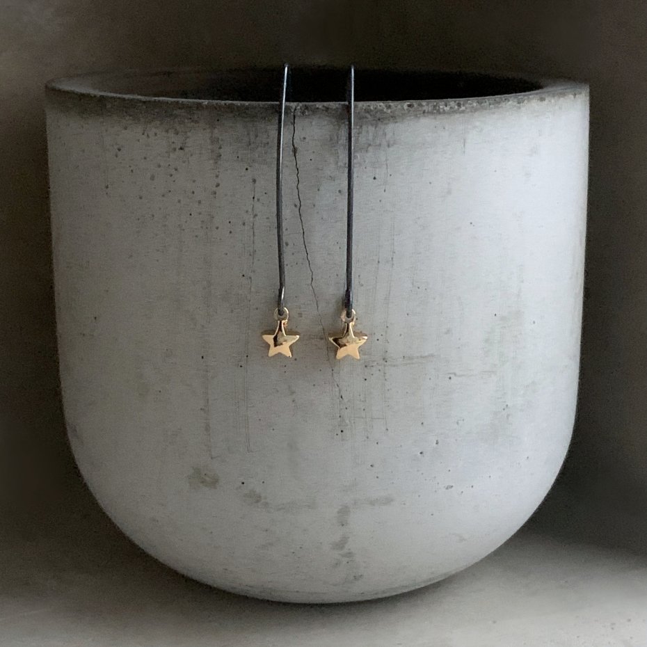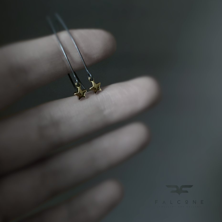 Kolczyki ze srebra i pozłacanego mosiądzu. Drobne gwiazdki z pozłacanego mosiądzu, efektownie odbijają światło połyskując, ciepłą, złotą barwą niczym prawdziwe gwiazdy. Gwiazdki są subtelne, zawieszone na długich, efektownych biglach. Średnica gwiazdek to 0,5 cm. Bigle typu rybki z oksydowanego srebra 925. Długość kolczyków to 3,5 cm.