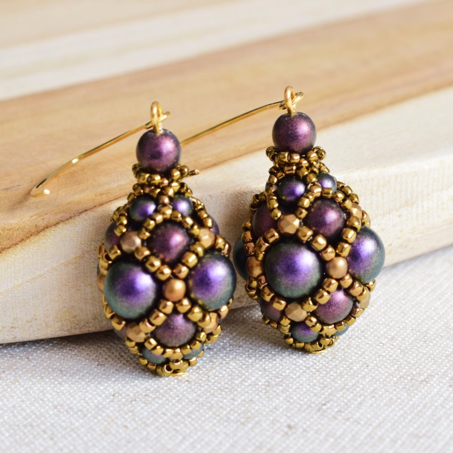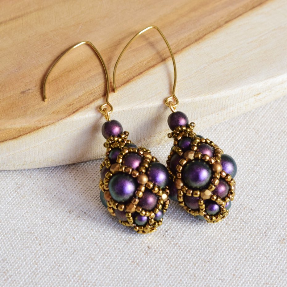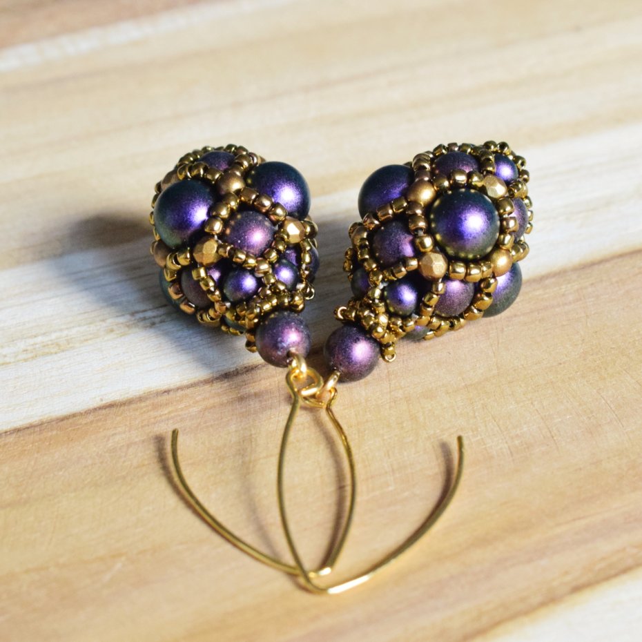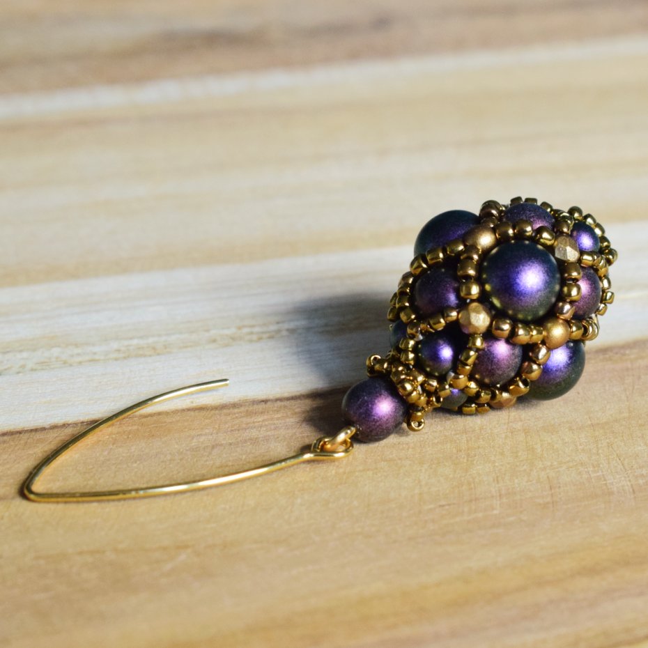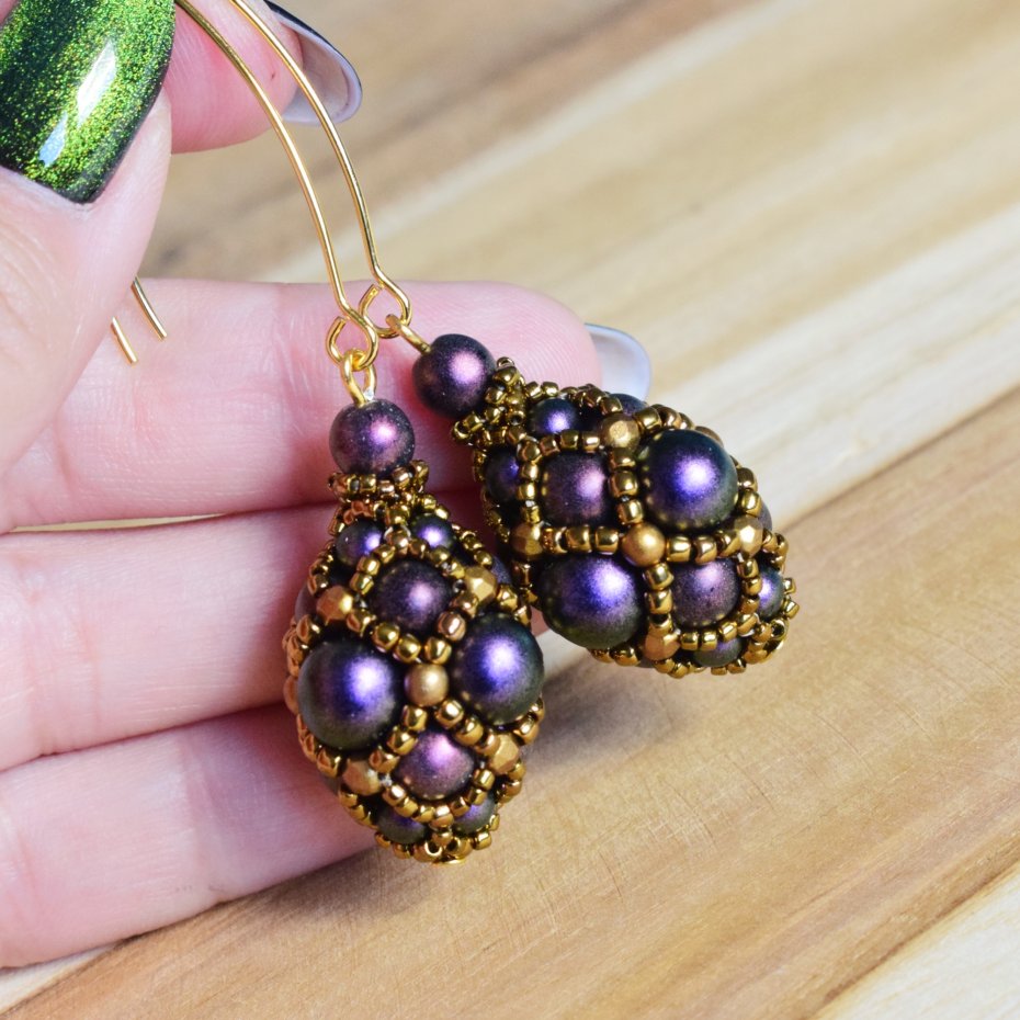W praktyce widzimy perełki o nieoczywistych odcieniach (głęboki, ciepły fiolet i burgund) i nieco chropowatej powierzchni, które oplatają drobne, metalizowane koraliki Toho w odcieniu antycznego brązu.