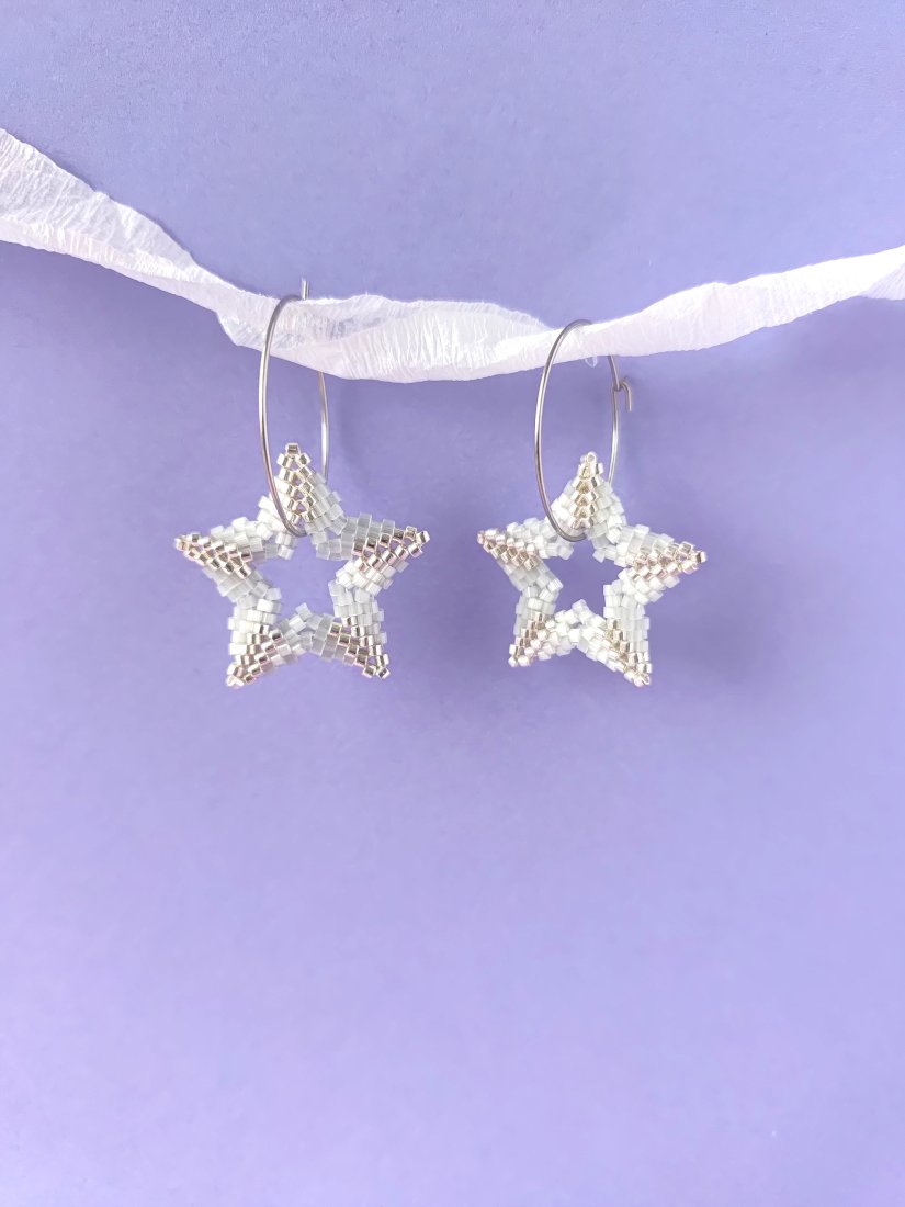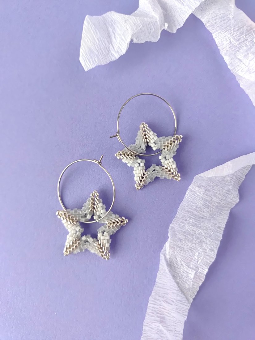 Małe, błyszczące gwiazdeczki, które zostały wyplecione w całości ręcznie – koralik po koraliku. Ich trójwymiarowa forma sprawia, że pięknie odbijają światło i delikatnie migoczą przy każdym ruchu. Zawieszone na subtelnych biglach-kółkach delikatnie się kołyszą i przyciągają spojrzenia.