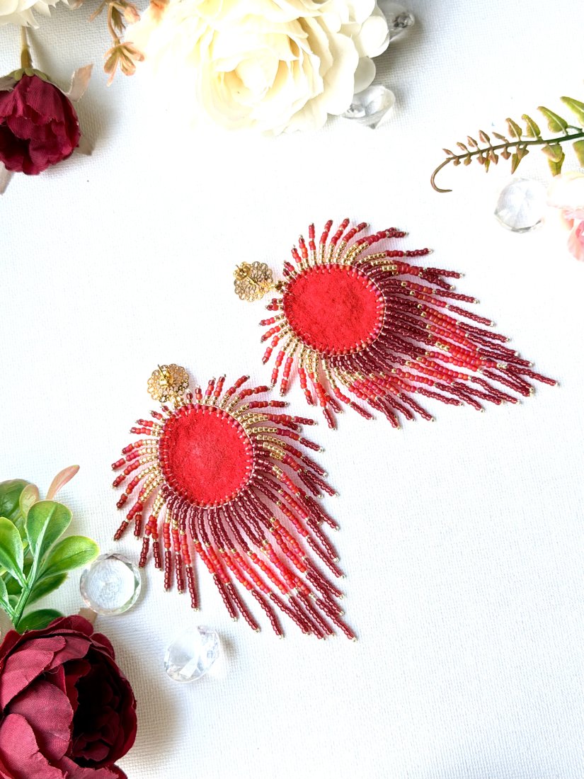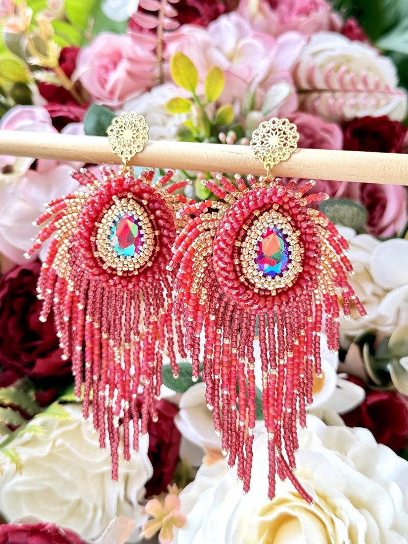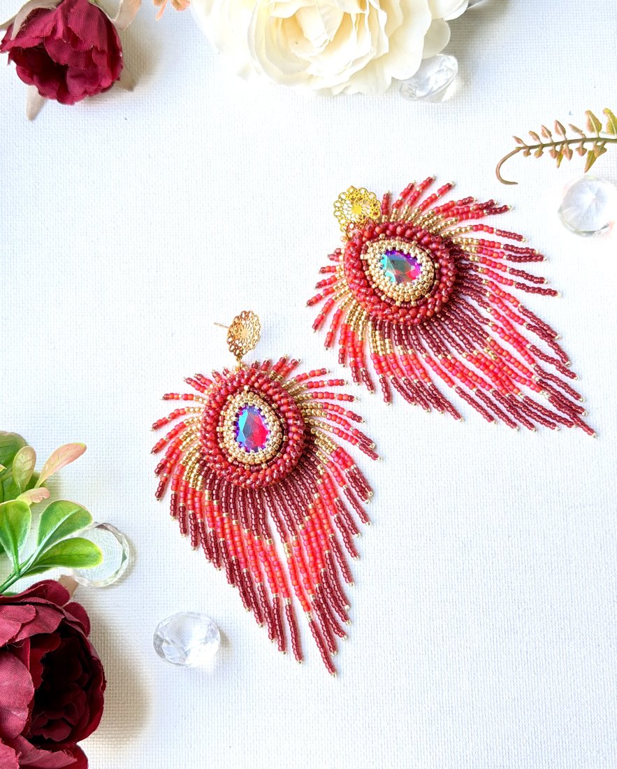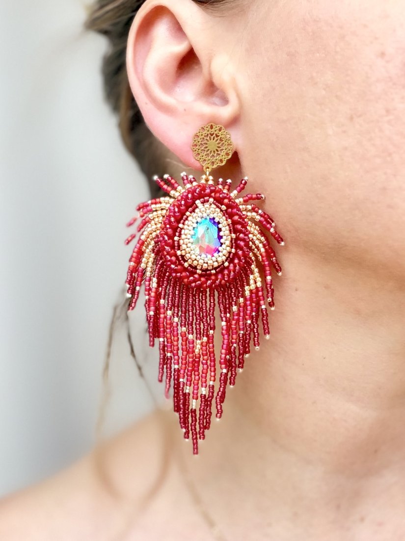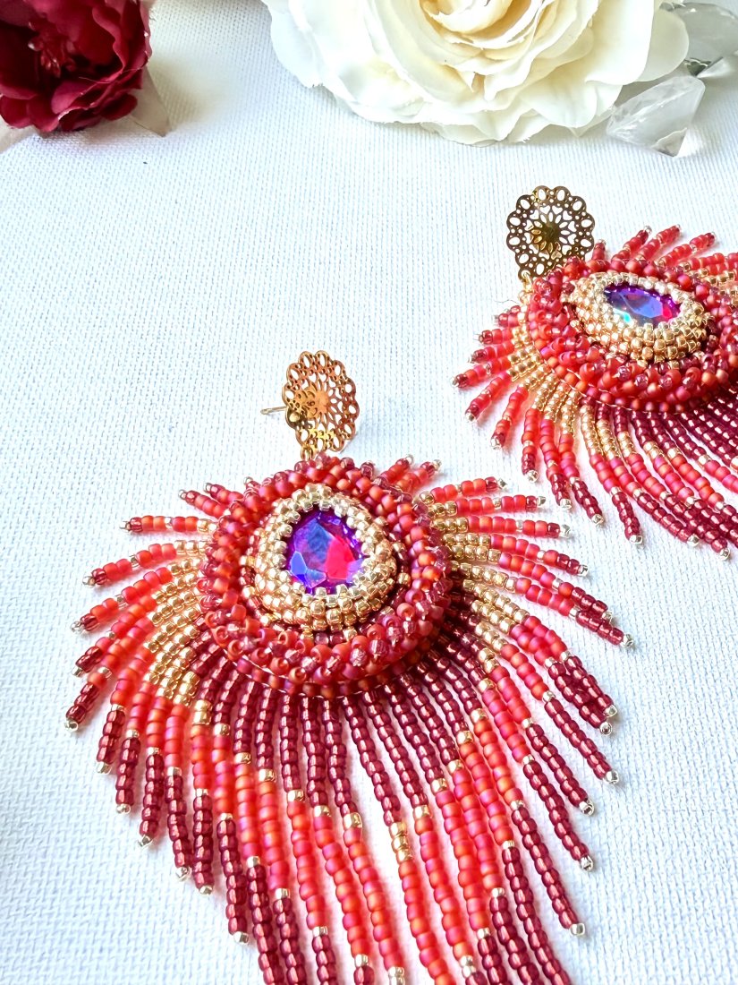 - **Unikalny design:** Inspirowane stylem glamour i bogactwem barw, te kolczyki przyciągają wzrok dzięki intensywnej czerwieni i złotym akcentom. Centralnym punktem są olśniewające, wielobarwne kamienie, które dodają im blasku i charakteru.