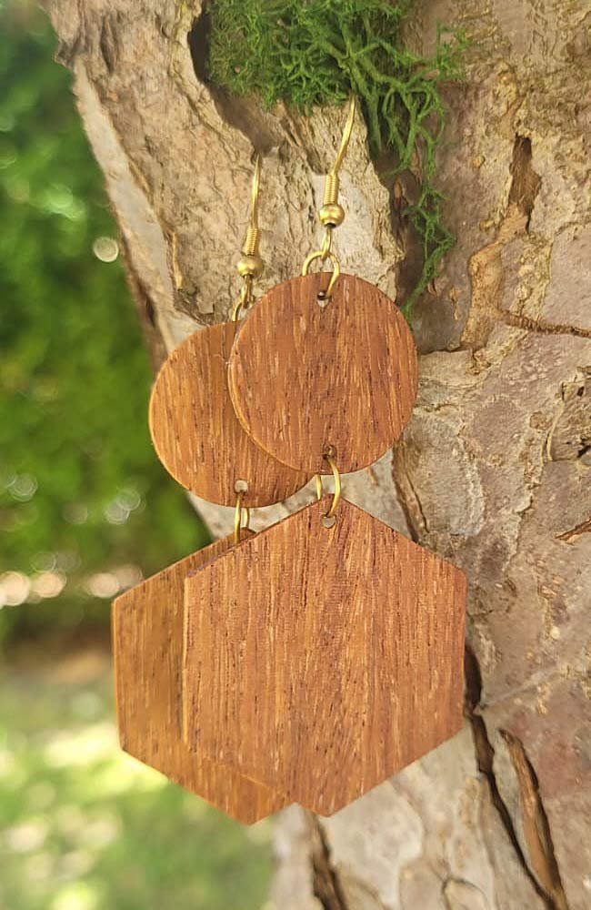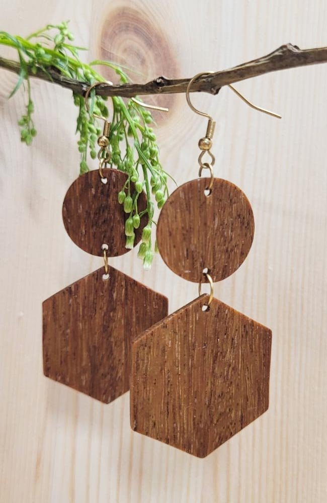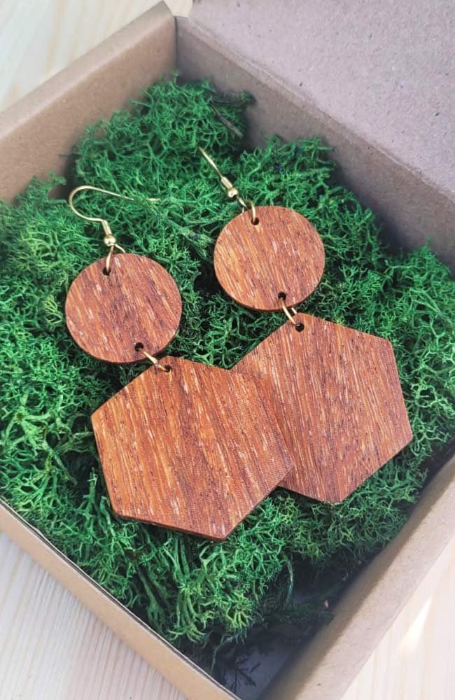 Geometryczne kolczyki wykonane ręcznie z drewna jesionowego lub z egzotycznego drewna cumaru (do wyboru). Elementy drewniane starannie szlifujemy i zabezpieczamy olejem.