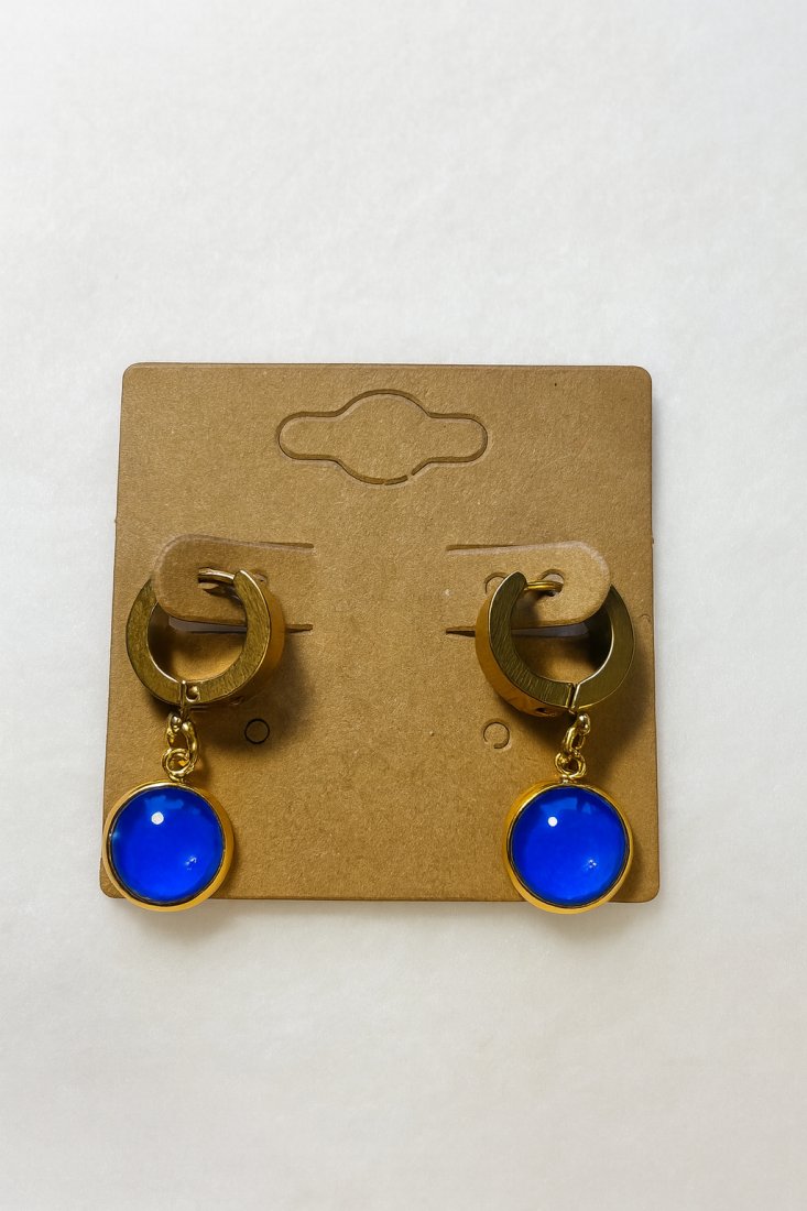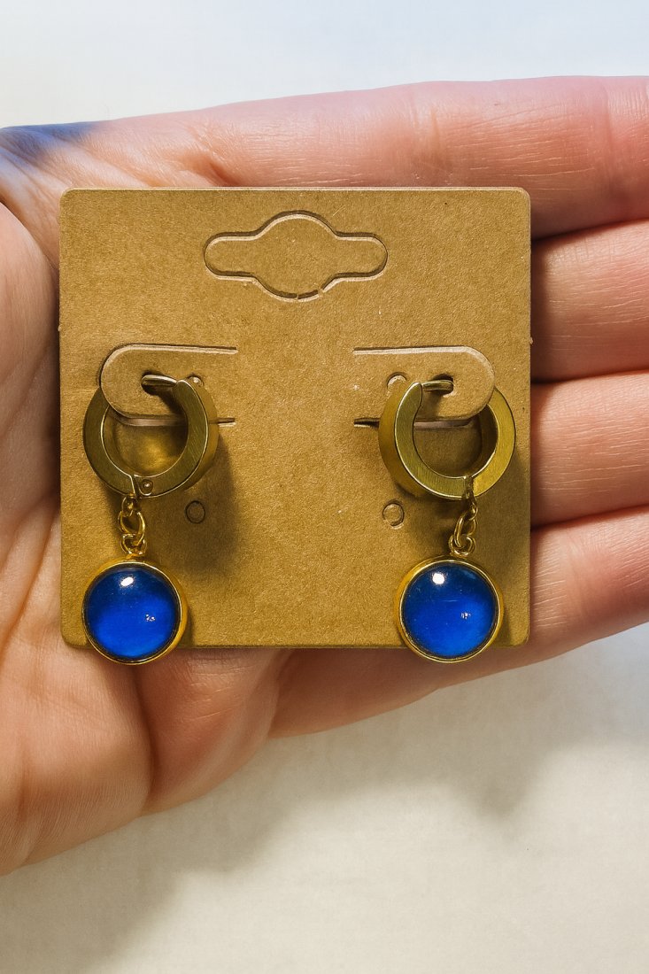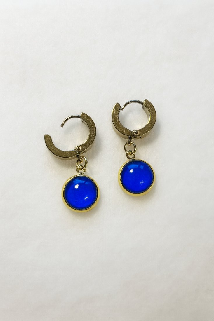 Złote kolczyki typu huggie z oczkiem w odcieniu chabrowego niebieskiego stanowią wyrazisty, ale nadal stonowany akcent kolorystyczny. Głęboki odcień przyciąga uwagę, jednocześnie pozostając łatwym do zestawiania z neutralną garderobą i klasycznymi formami.