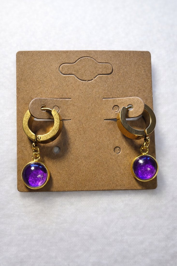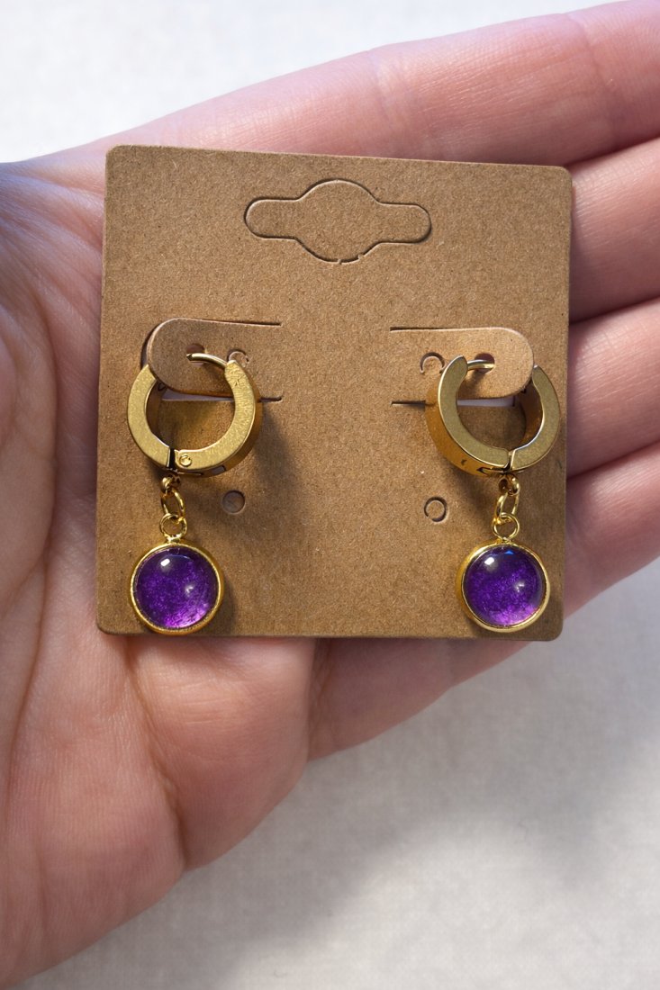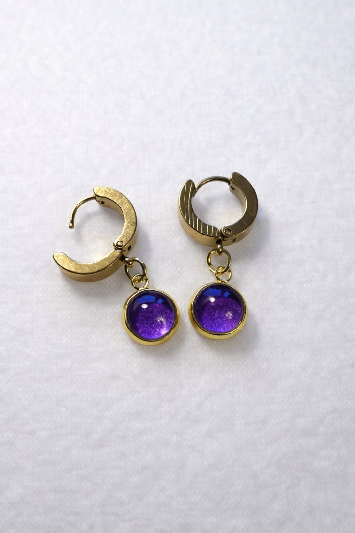 Złote kolczyki typu huggie z niewielkim oczkiem w odcieniu fioletu to subtelny akcent kolorystyczny, który łatwo wkomponować w codzienne stylizacje. Fiolet pozostaje stonowany i spokojny, dzięki czemu biżuteria zachowuje minimalistyczny charakter, typowy dla kolekcji ESSENCE.