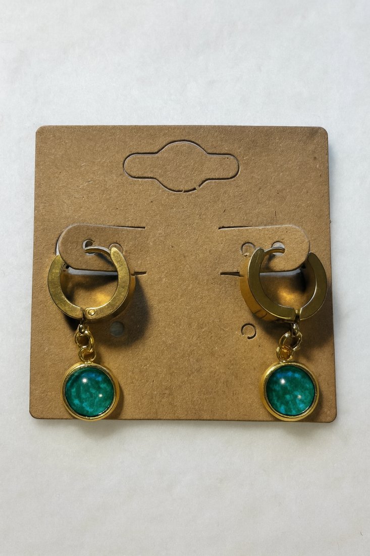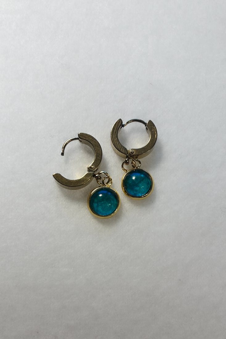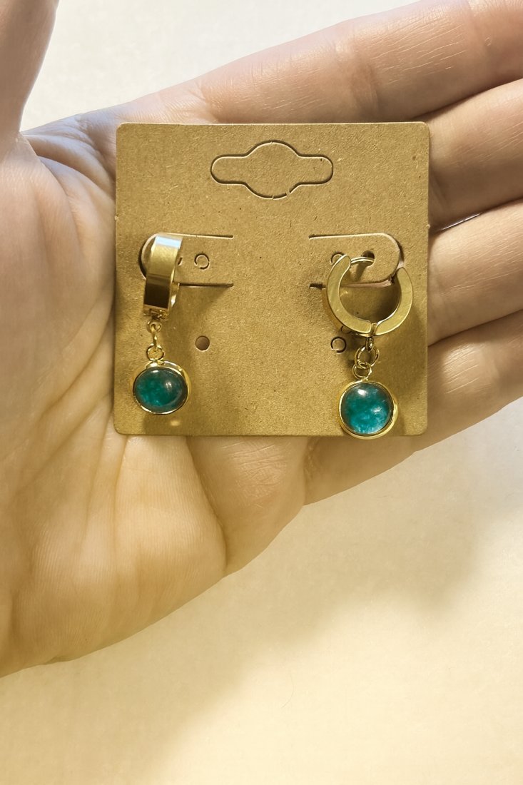 Zapięcie typu huggie w kolorze złotym delikatnie otula ucho, a zawieszone pod nim oczko w odcieniu głębokiej zieleni przyciąga spojrzenia pięknym połyskiem. Intensywny kolor został uzyskany dzięki zatopieniu papieru artystycznego pod szklanym kaboszonem, co tworzy efekt głębi charakterystyczny dla biżuterii PAPER N3RD.