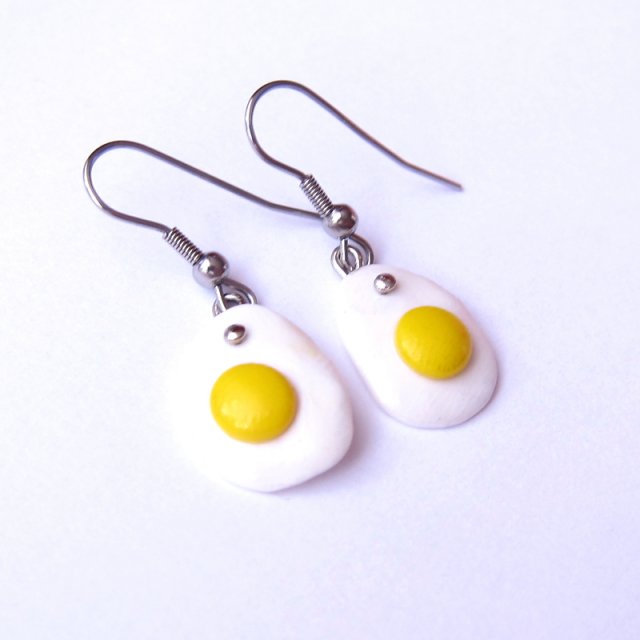 Zabawne kolorowe kolczyki wykonane ręcznie z masy termoutwardzalnej Fimo w kształcie jajek sadzonych. Wielkość kolczyków to ok. 15 mm (35mm z biglami). Bigle wykonane są ze stali chirurgicznej. Kolczyki świetne na prezent. Zobacz moją całą galerię w Decobazaar!