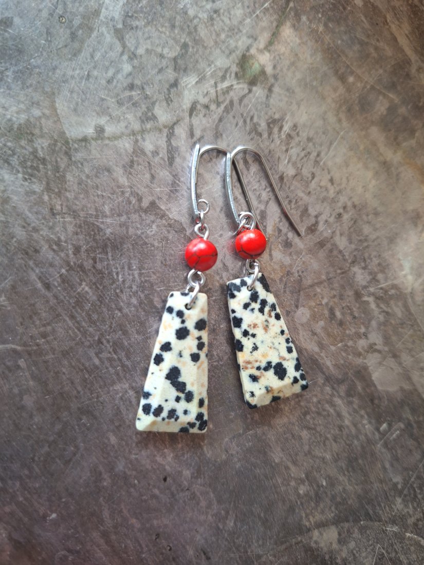 Trapezy z jaspisu dalmatyńskiego (około 2,5 cm długości), koralik jaspisu czerwonego, na biglu wiszącym.