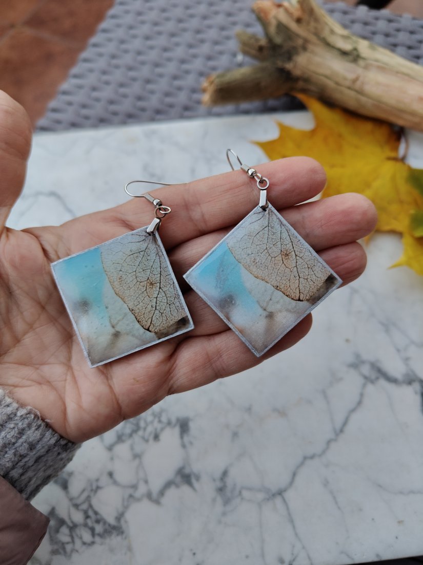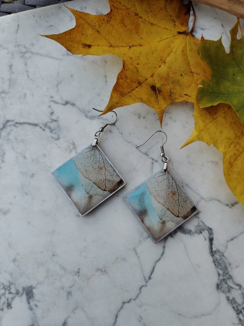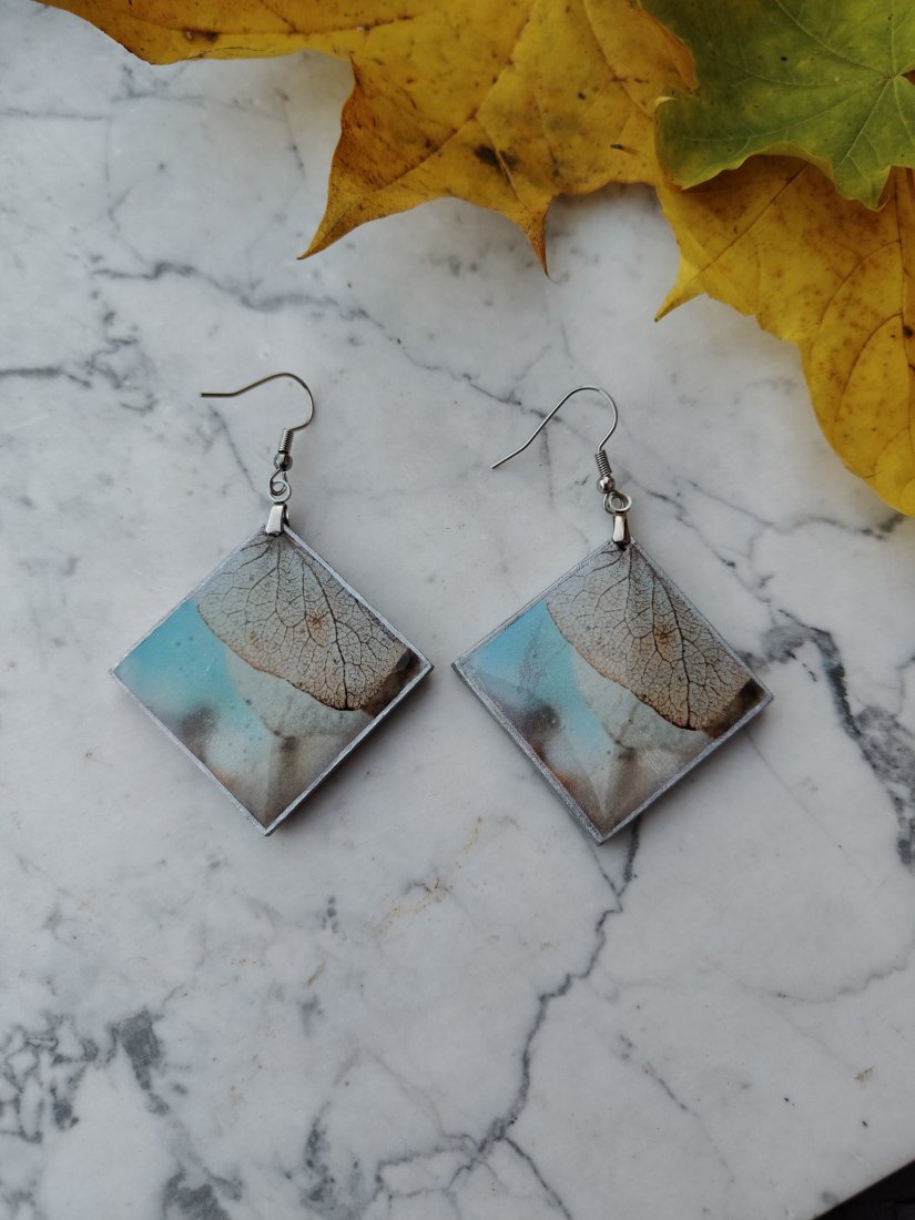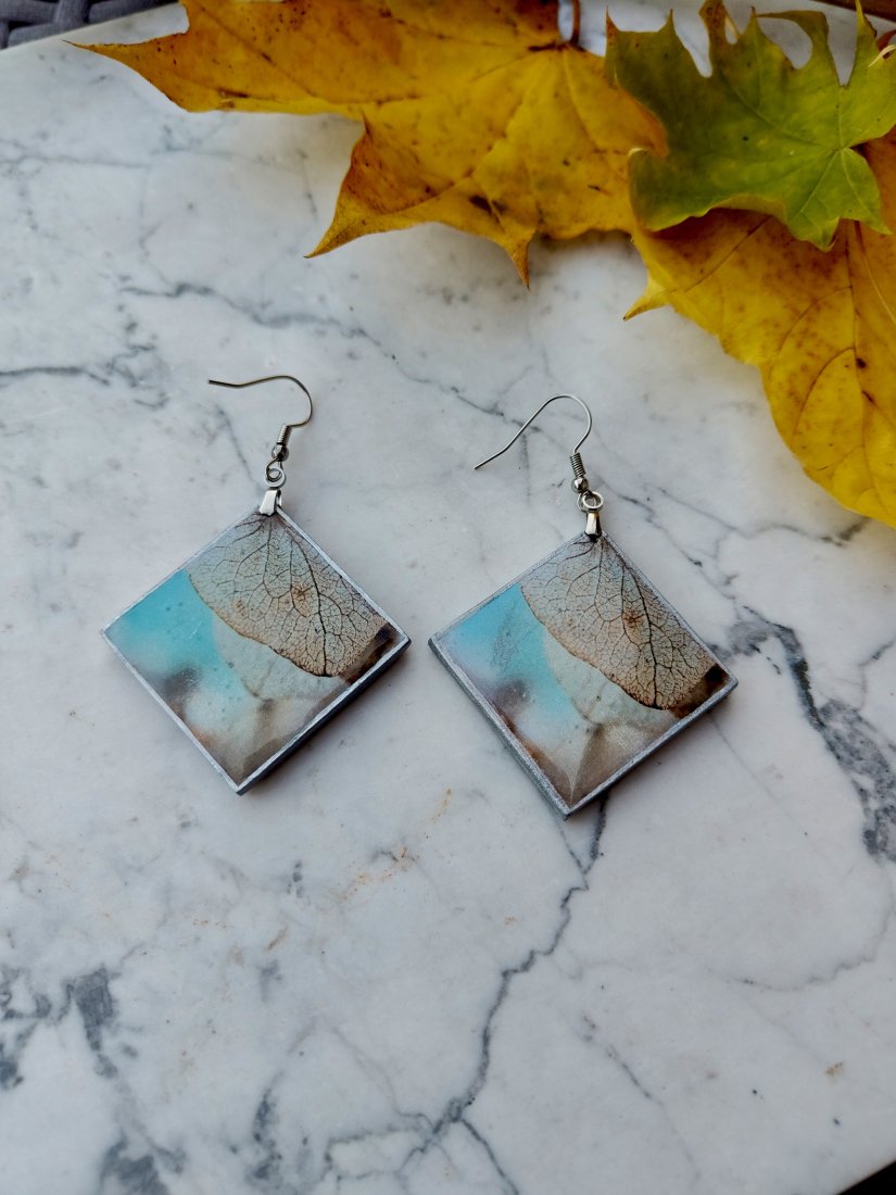 Ręcznie wykonane kolczyki w kształcie rombów, ozdobione delikatnym motywem roślinnego liścia utrwalonego w żywicy. Subtelne połączenie turkusu, beżu i naturalnych przebarwień tworzy harmonijną, jesienną kompozycję. Kolczyki są lekkie, eleganckie i idealne dla osób ceniących unikatową biżuterię inspirowaną naturą.
