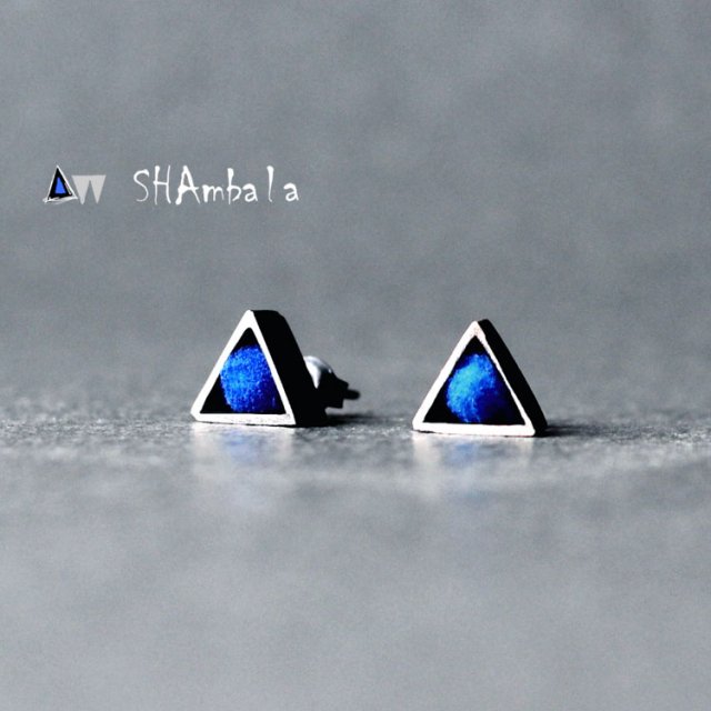 Urocze, drobne kolczyki na sztyft. Wewnątrz srebrnej formy osadzony jest urocza, malutka kulka akrylowa w kolorze kobaltu. Bok trójkąta mierzy 1 cm. Gorąco polecam:)