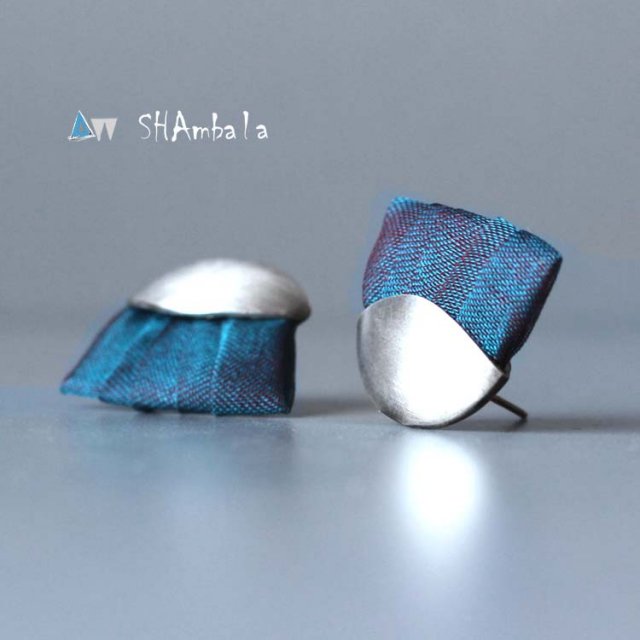 Delikatne, romantyczne kolczyki na sztyft. Wykonane zostały z jasnego srebra oraz jedwabnej tafty opalizującej odcieniami ciemnego turkusu i bordo. Ich wyjątkowa forma stanowić będzie elegancką ozdobę na każdą okazję. Wymiary srebrnej łuski: 2,4 na 1,4 cm. Gorąco polecam:)