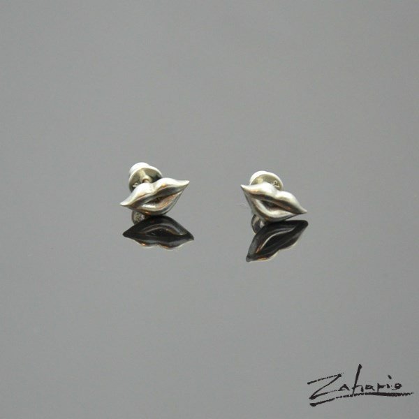 Wykonane ręcznie ze srebra kolczyki w kształcie złożonych do pocałunku ust. Sztyft wykonany ze srebra. Żłobienia i detale tworzone pod lupą.