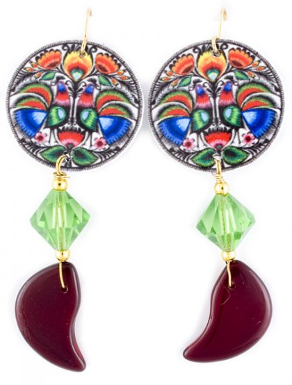 materiały: tworzywo sztuczne, szklane szlifowane koraliki, koraliki jablonex oraz pozłacany drucik.