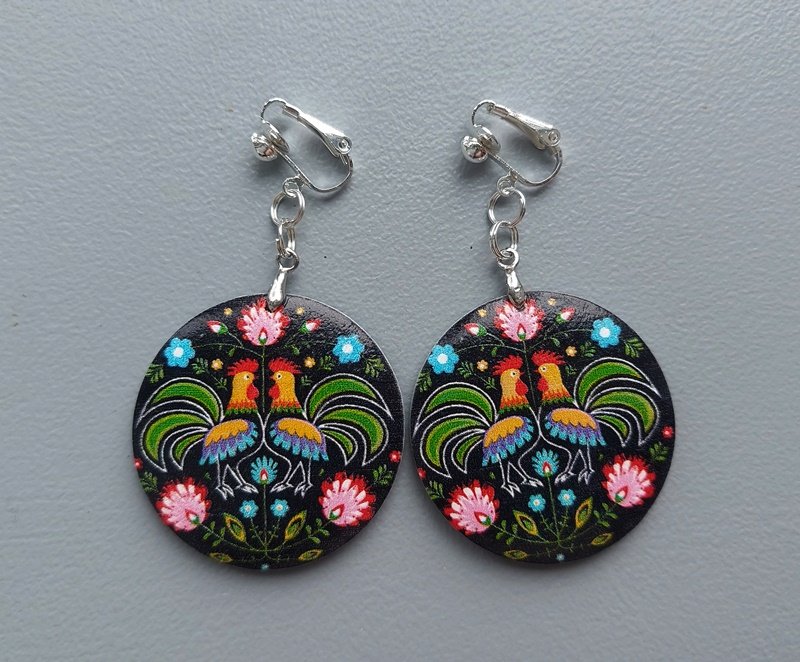 Ręcznie wykonane klipsy z zadrukowanych drewnianych mandali. Pomimo swoich rozmiarów nie są ciężkie, za to stanowią prawdziwą ozdobę przyciągającą wzrok. Wyraziste, kolorowe, oryginalne i efektowne.