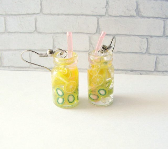 Apetyczne kolczyki wykonane z małych szklanych buteleczek wypełnionych maleńkimi owocami, idealne do letnich stylizacji. Kolczyki bardzo lekkie :)