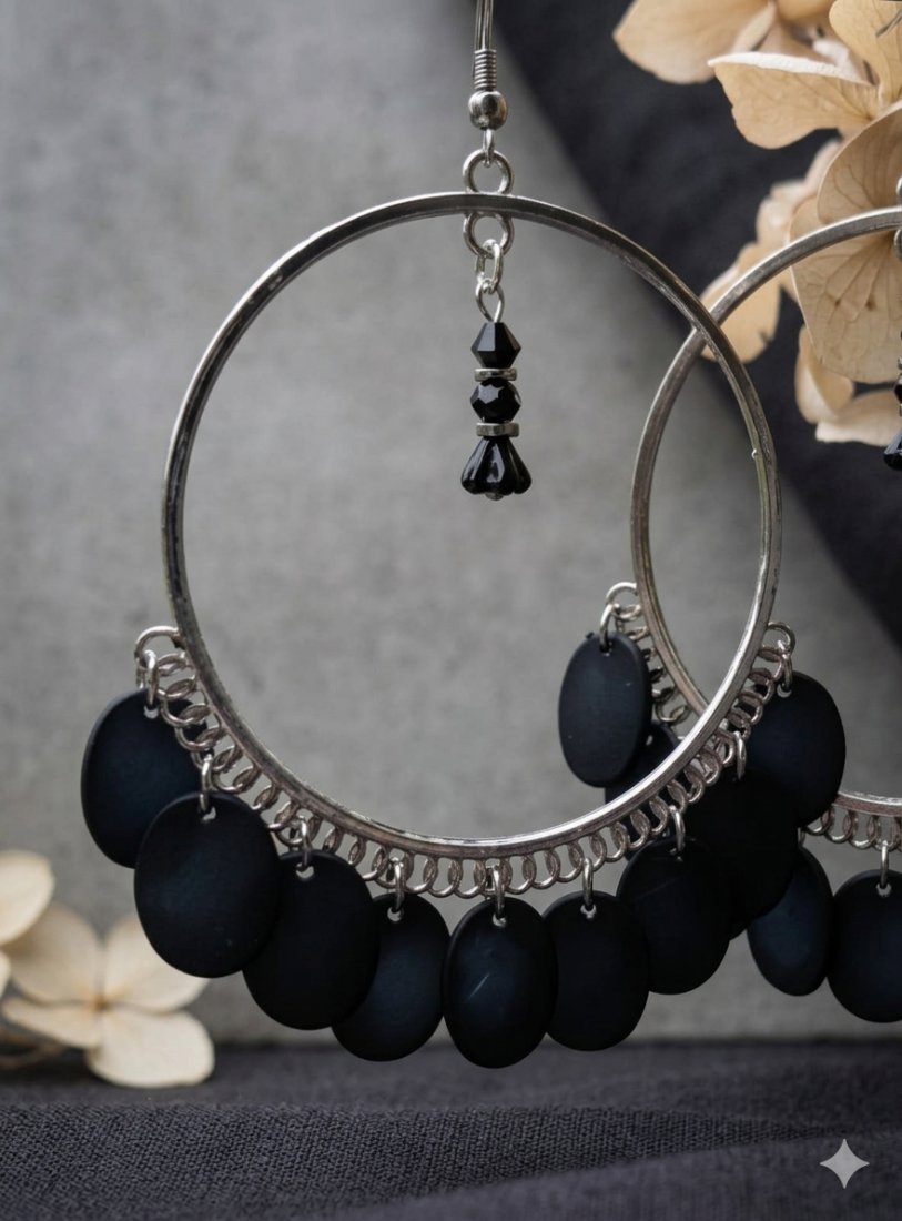 Kolczyki Na metalowej bazie koraliki płaskie oliwki czarne akrylowe lekkie i kwatek, oponki szklane , przekładki hematyt. Średnica koła 6 cm, bigle stal, baza kolczyka to gotowy produkt metalowy. Długość kolczyka z biglem 10 cm