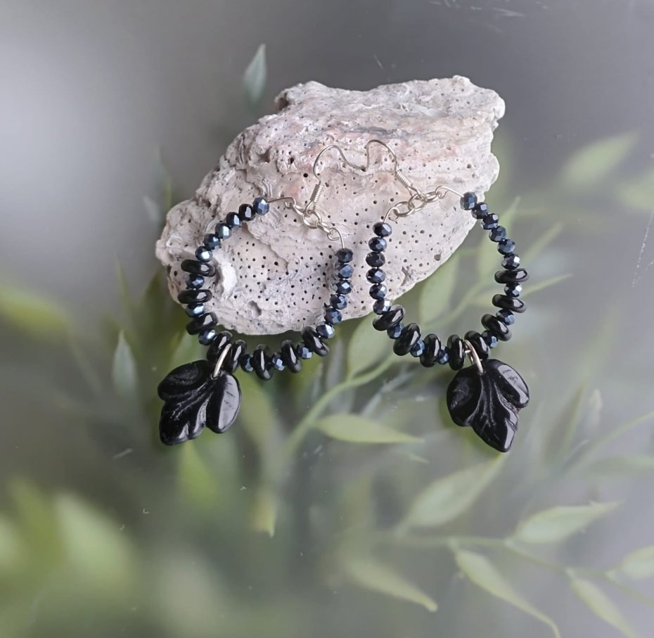Kolczyki koła małe z koralików szklanych, oponki szklane, kryształki. Szklany liść w kolorze czarnym. Średnica koła 3 cm, bigiel metalowy , długość 7 cm