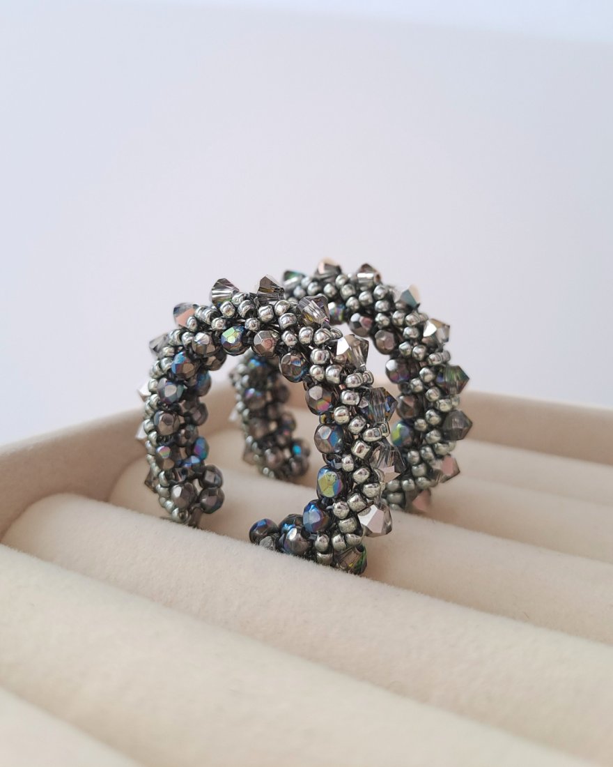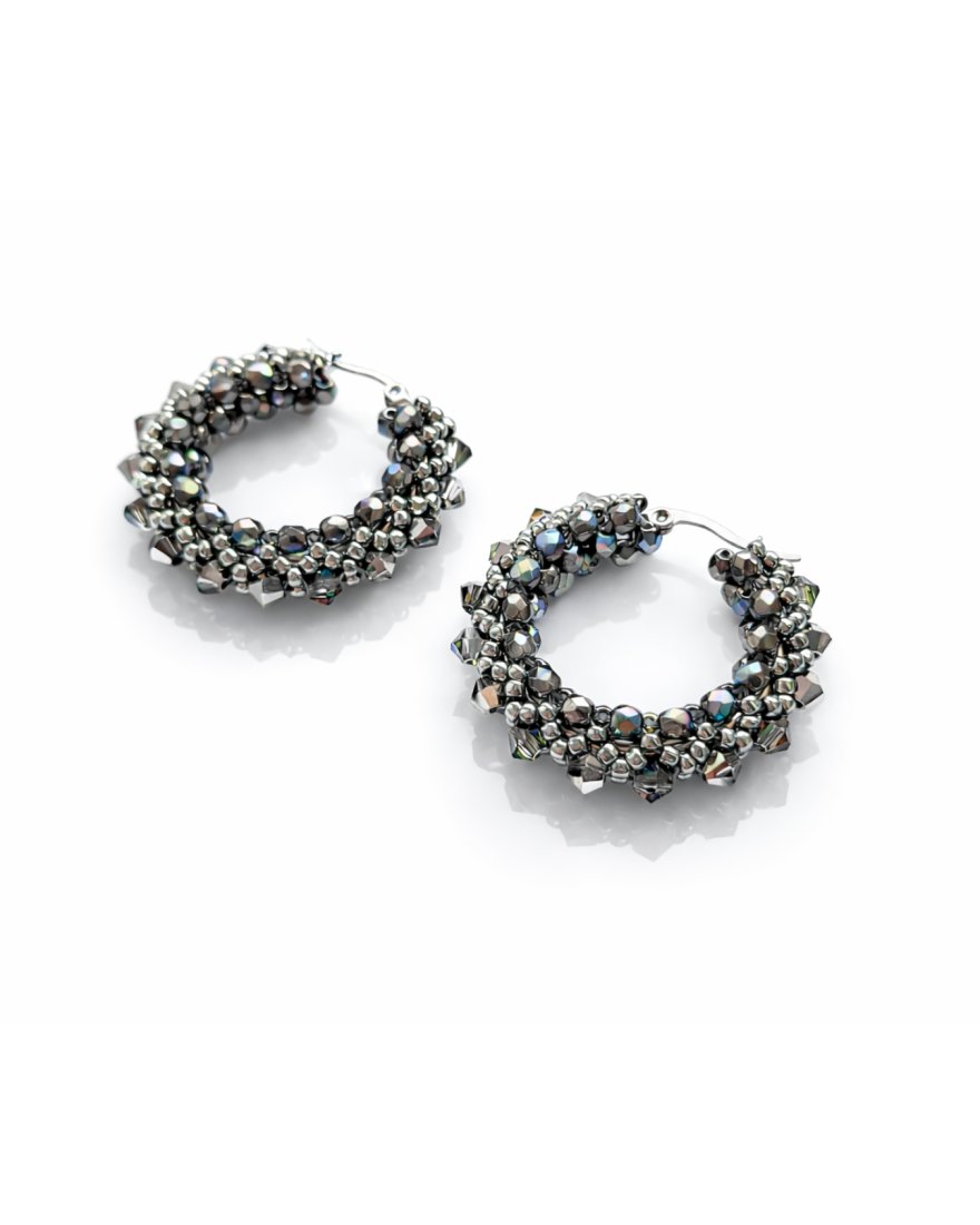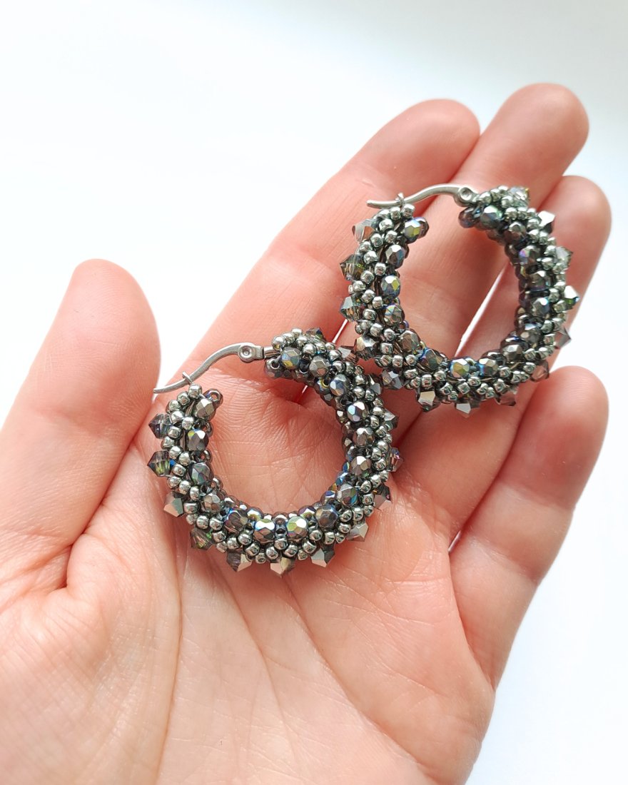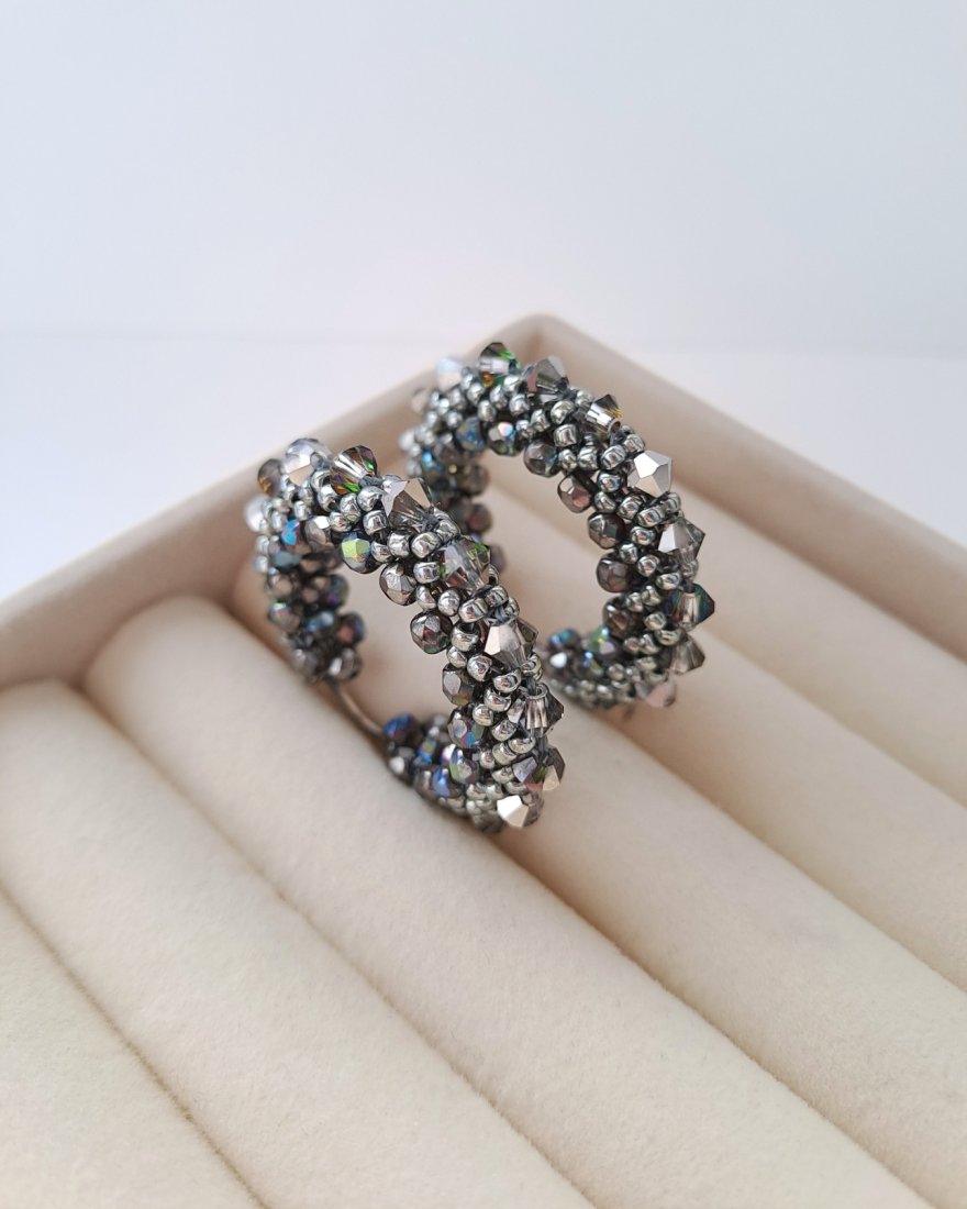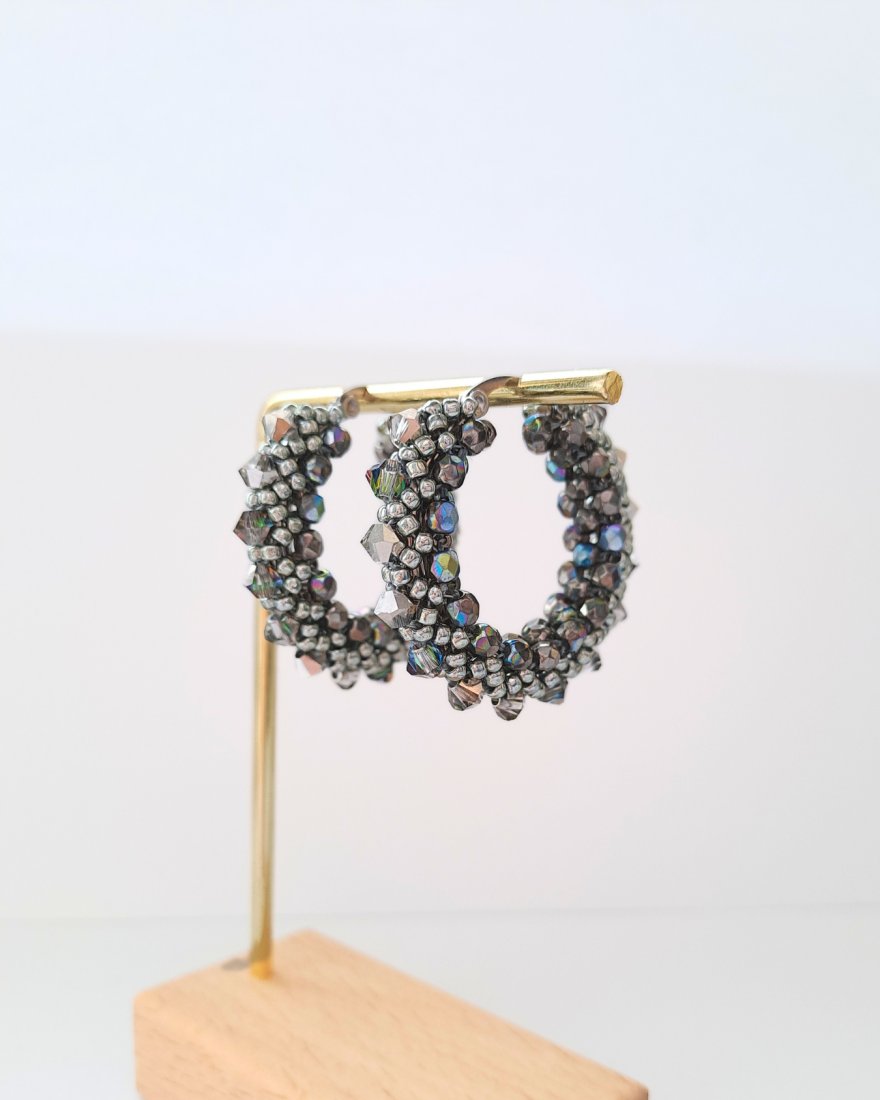 Tagi: #duże lekkie kolczyki, #geometryczna biżuteria, #okrągłe kolczyki z koralików, #szaro srebrne kolczyki koła