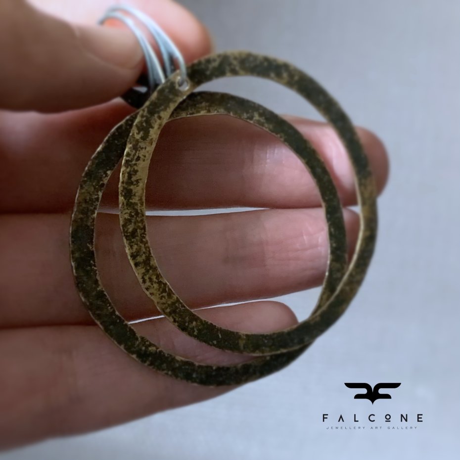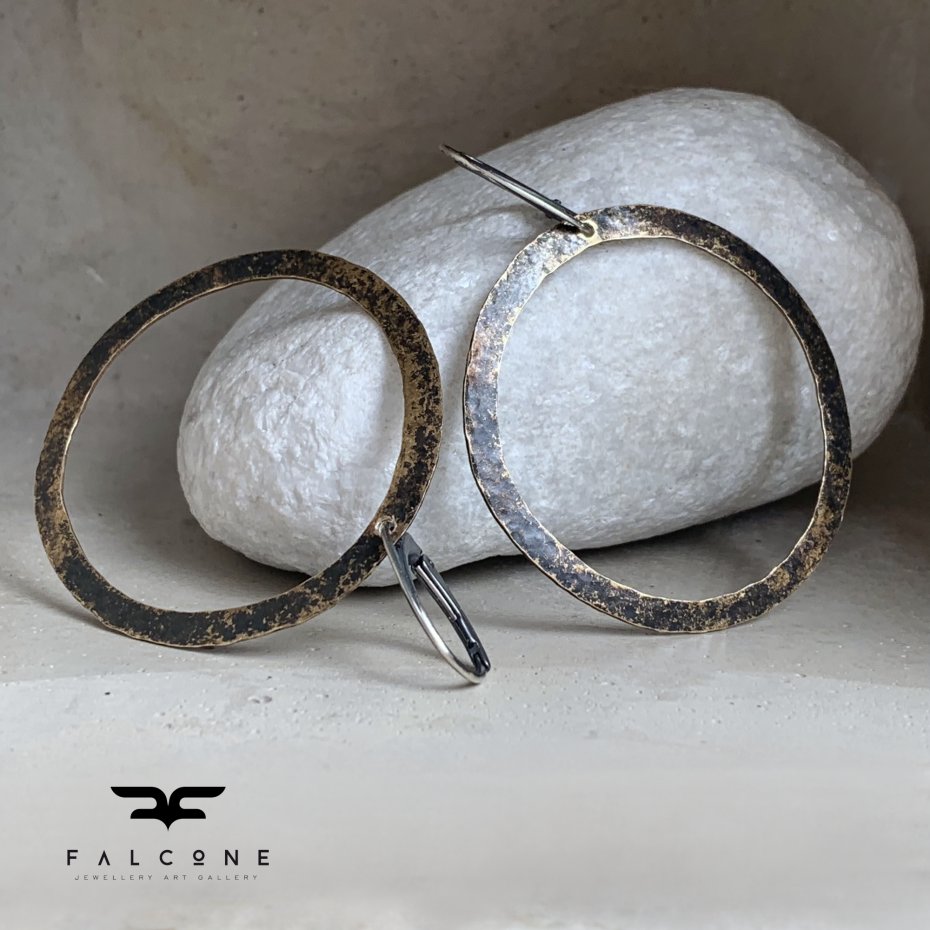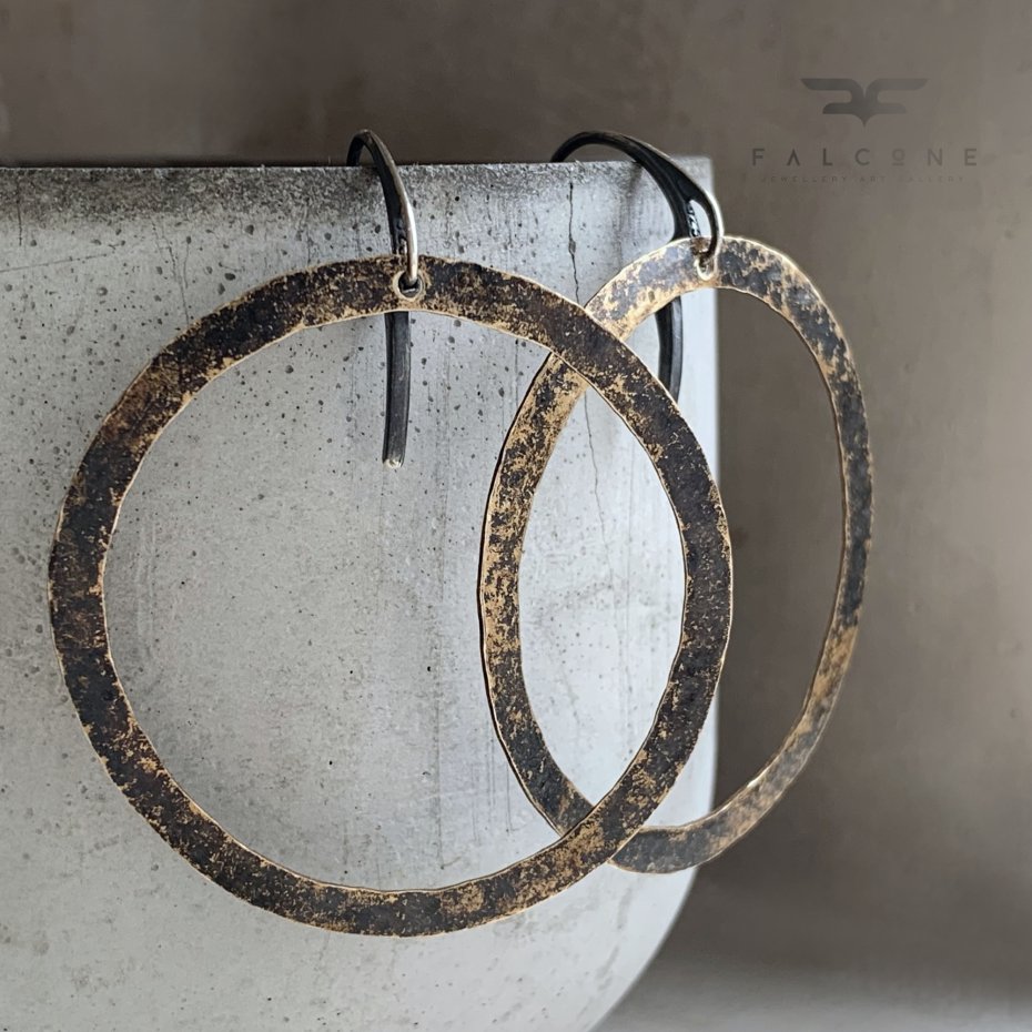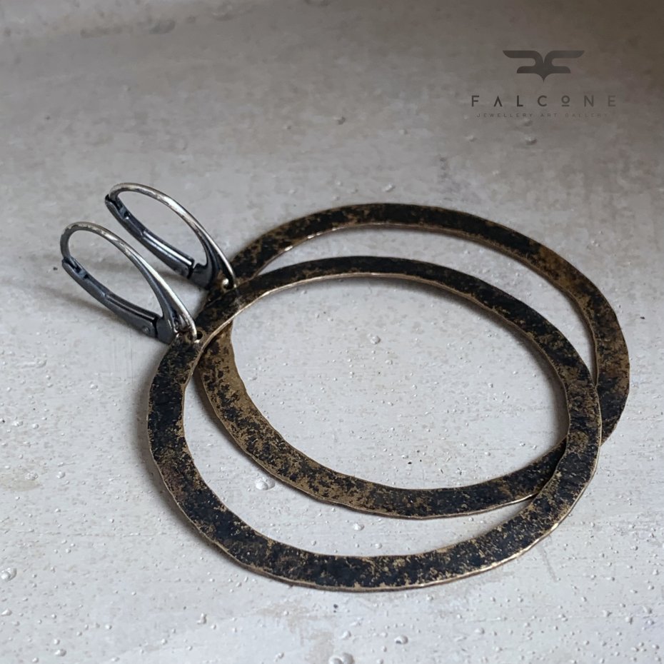 Kolczyki ze srebra i mosiądzu. Duże, efektowne, nieregularne koła z kutego mosiądzu. Mosiądz patynowany na niejednolity kolor w tonacjach od czerni do gorzkiego brązu, z jaśniejszymi przetarciami w kolorze naturalnej, złotej barwy mosiądzu. Repusowana, kuta powierzchnia podkreśla rustykalny charakter kolczyków. Bigle angielskie ze srebra 925. Średnica kół to ok. 4,5 cm. Długość kolczyków to ok. 6 cm.