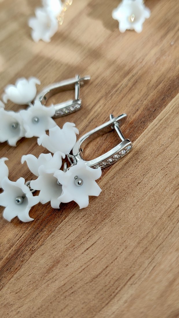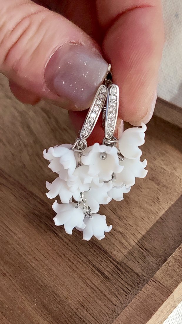 Te subtelne kolczyki w kształcie konwalii to połączenie realistycznej florystyki i biżuteryjnej precyzji. Każdy kwiatek został przeze mnie ręcznie uformowany z profesjonalnej modeliny Cernit, co sprawia, że są niezwykle lekkie i komfortowe w noszeniu, mimo bogatego wyglądu.