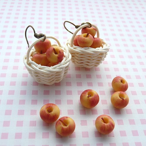 Urocze kolczyki - miniaturowe koszyczki pełne pysznych dojrzałych jabłuszek:) długość całkowita kolczyka: ok.3,5cm, wysokość samego koszyczka: 2cm. Wysyłam ozdobnie zapakowane;)