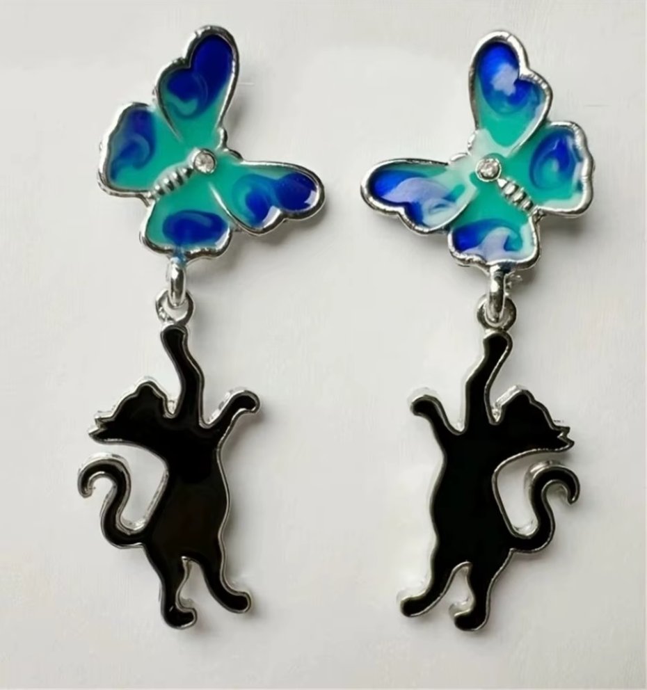 K7481 Cudne kolczyki na sztyftach z czarnym kotem i niebieskim motylem.