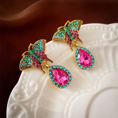 Pięknę, wyraziste kolczyki mieniące się kolorowymi kryształkami, część w kształcie motyli.