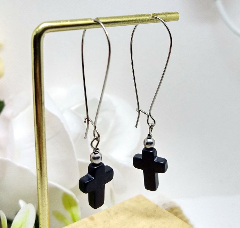 K6550 Kolczyki na wysokich biglach z hematytowym czarnym krzyżem.