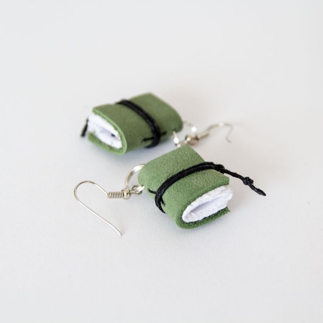 Kolczyki mają skórzaną okładkę (skóra odzyskana), a w środku ręcznie szyte kartki z papieru.