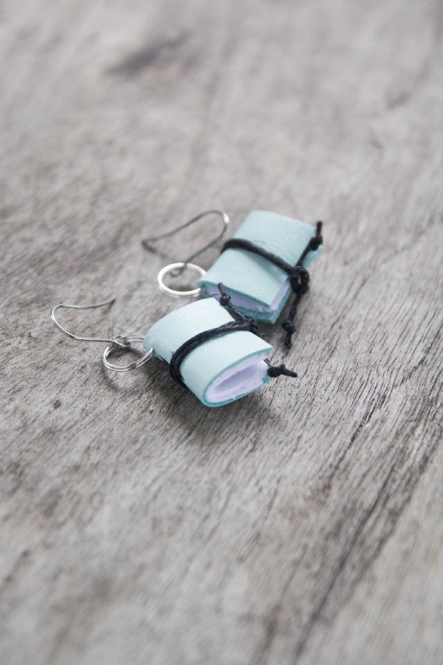 Kolczyki mają skórzaną okładkę (skóra odzysk), a w środku ręcznie szyte kartki z papieru.