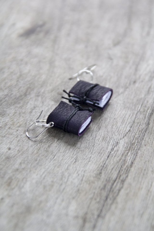 Kolczyki mają skórzaną okładkę (skóra odzysk), a w środku ręcznie szyte kartki z papieru.