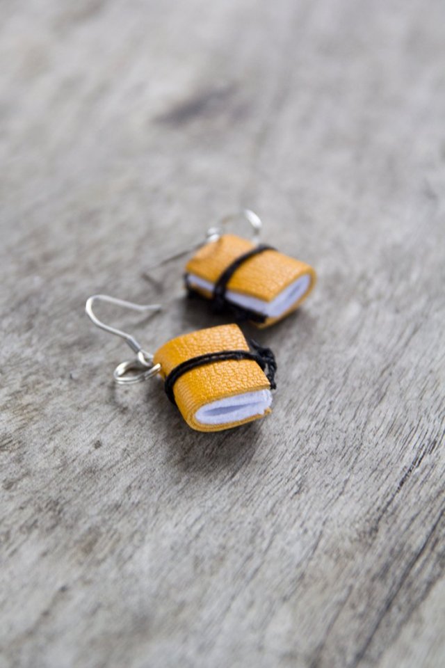 Kolczyki mają skórzaną okładkę (skóra odzysk), a w środku ręcznie szyte kartki z papieru.