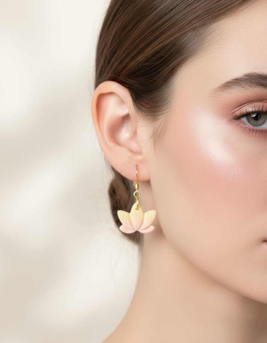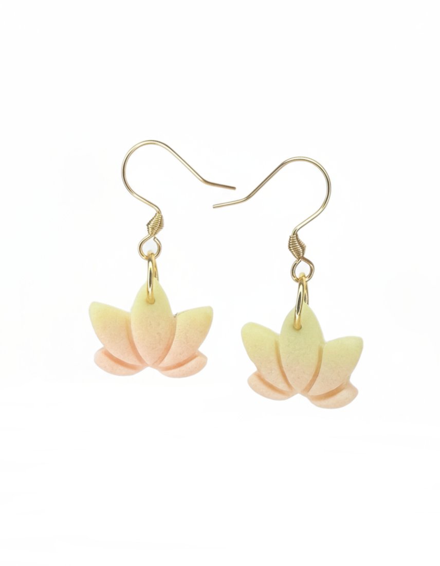 Delikatne, a jednocześnie przyciągające wzrok kolczyki w kształcie kwiatu lotosu. Wykonane z gliny polimerowej z efektem ombre w kolorze żółto-różowym.