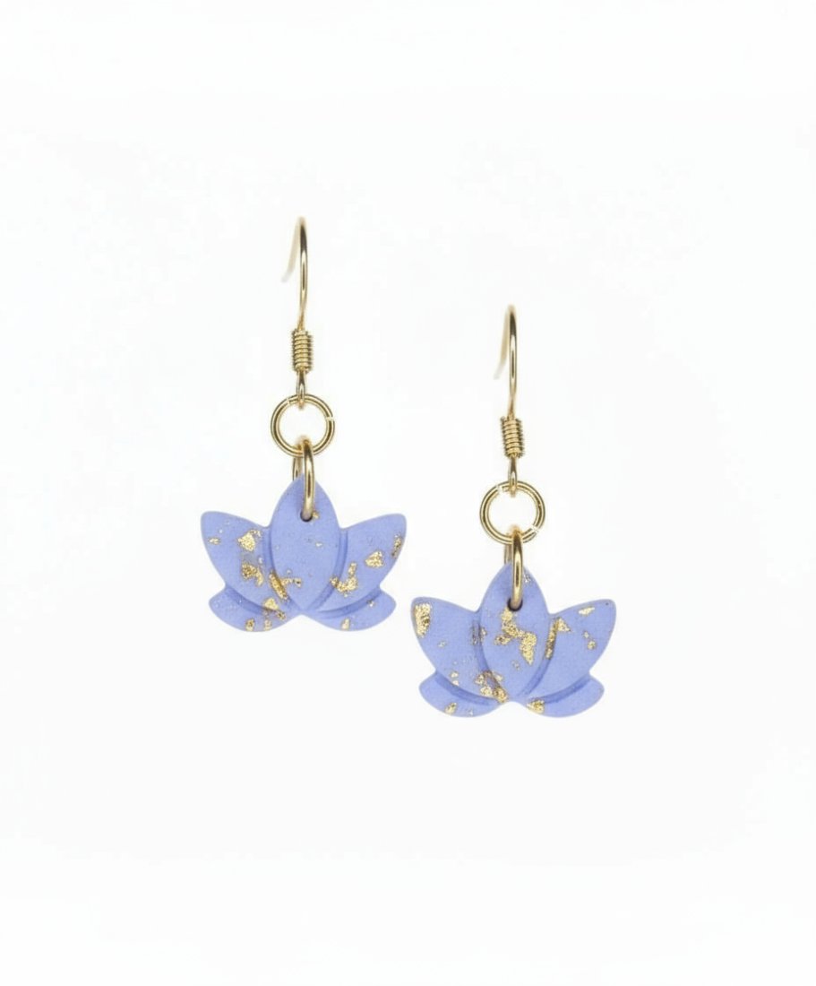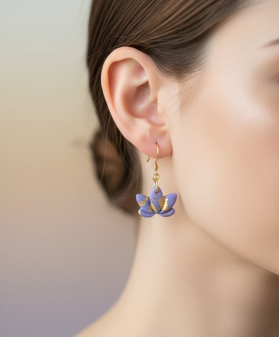 Delikatne, a jednocześnie przyciągające wzrok kolczyki w kształcie kwiatu lotosu. Wykonane z gliny polimerowej w odcieniu periwinkle blue i ozdobione subtelnymi drobinkami złota, które dodają im lekkości i blasku.