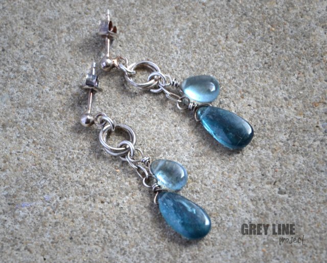 Kolczyki wykonane z oksydowanego i przecieranego srebra próby 925 oraz gładkich kropel kyanitu royal moss klasy AAA oraz akwamarynu.