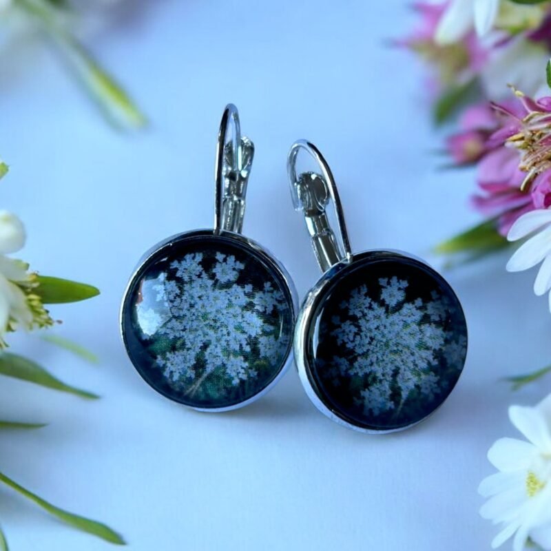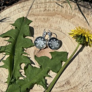 Proste kolczyki na biglu angielskim ozdobione są szklanym, przezroczystym kaboszonem, pod którym znajduje się papier ze zdjęciem polskich roślin łąkowych – w tym subtelnego aminka, który symbolizuje spokój, lekkość i naturalne piękno.