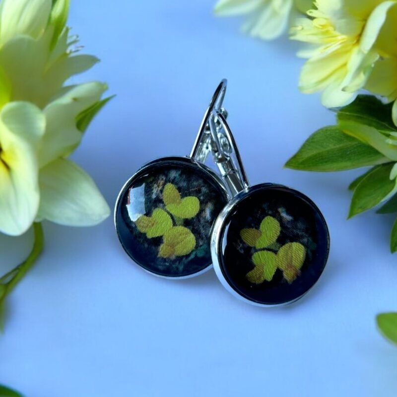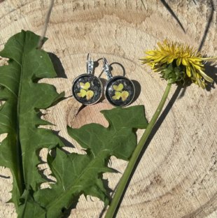 Proste kolczyki na biglu angielskim ozdobione są szklanym, przezroczystym kaboszonem, pod którym znajduje się papier ze zdjęciem polskich roślin łąkowych – w tym żółtej komonicy, symbolu słońca, radości i naturalnej energii.