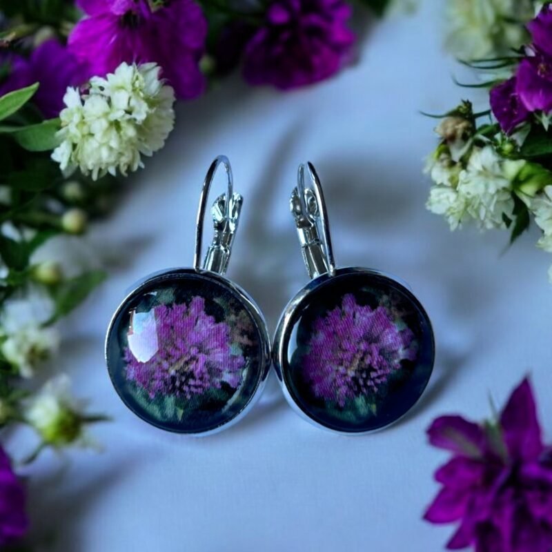 Proste kolczyki na biglu angielskim ozdobione są szklanym, przezroczystym kaboszonem, pod którym zatopiono papier ze zdjęciem polskich roślin łąkowych – w tym delikatnej koniczyny, symbolu szczęścia, harmonii i natury.