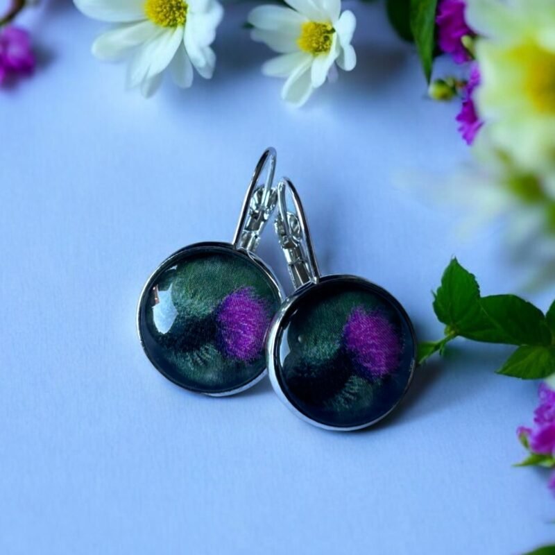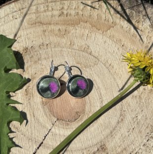 Proste kolczyki na biglu angielskim ozdobione są szklanym, przezroczystym kaboszonem, pod którym znajduje się papier ze zdjęciem polskich roślin łąkowych – w tym wyrazistego ostu, symbolizującego siłę, wolność i naturalne piękno.