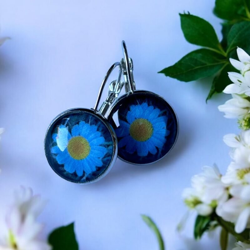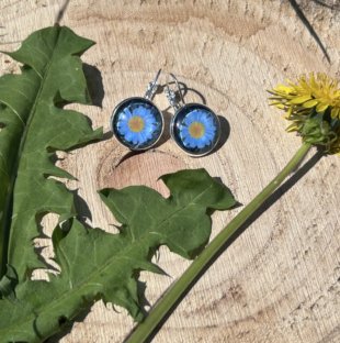 Proste kolczyki na biglu angielskim ozdobione są szklanym, przezroczystym kaboszonem, pod którym zatopiono papier ze zdjęciem polskich roślin łąkowych, w tym delikatnego rumianku – symbolu spokoju, naturalności i łagodności.