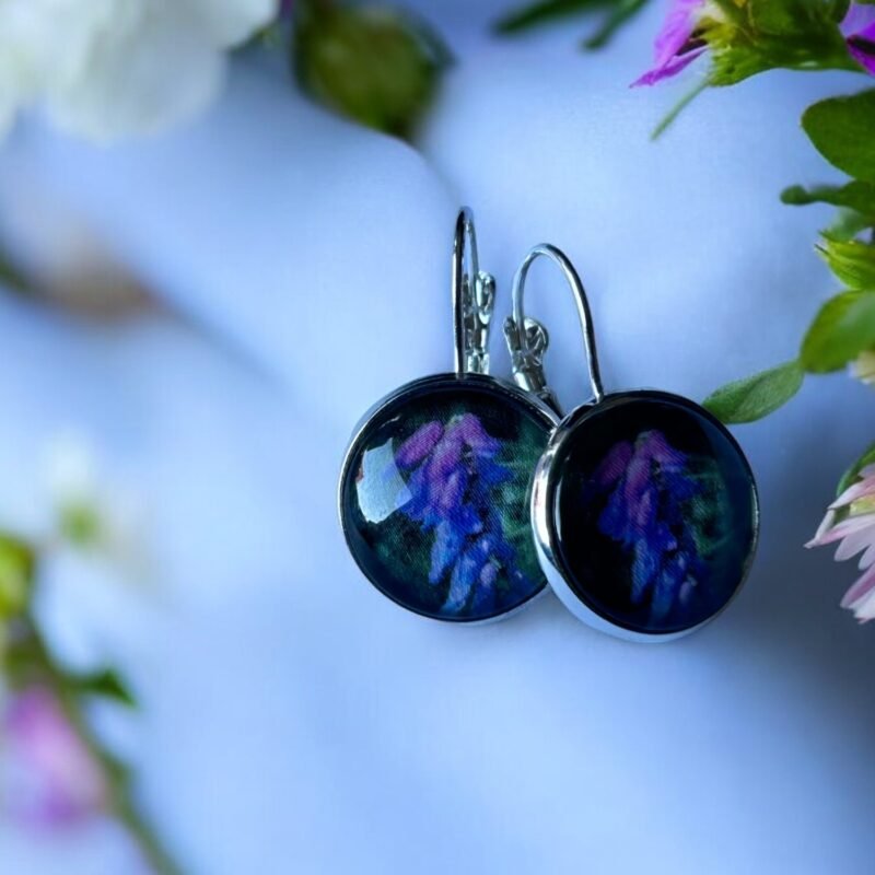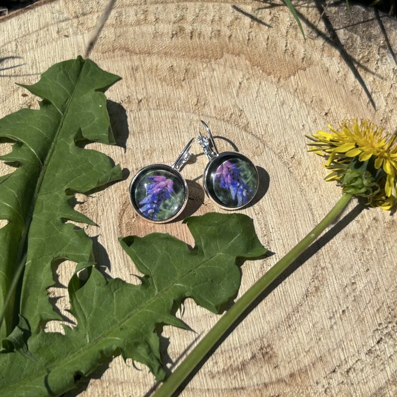 Proste kolczyki na biglu angielskim ozdobione są szklanym, przezroczystym kaboszonem, pod którym znajduje się papier ze zdjęciem polskich roślin łąkowych, w tym subtelnej wyki. Ich motyw roślinny w połączeniu z chłodnym blaskiem srebra tworzy biżuterię lekką, kobiecą i pełną naturalnego uroku.