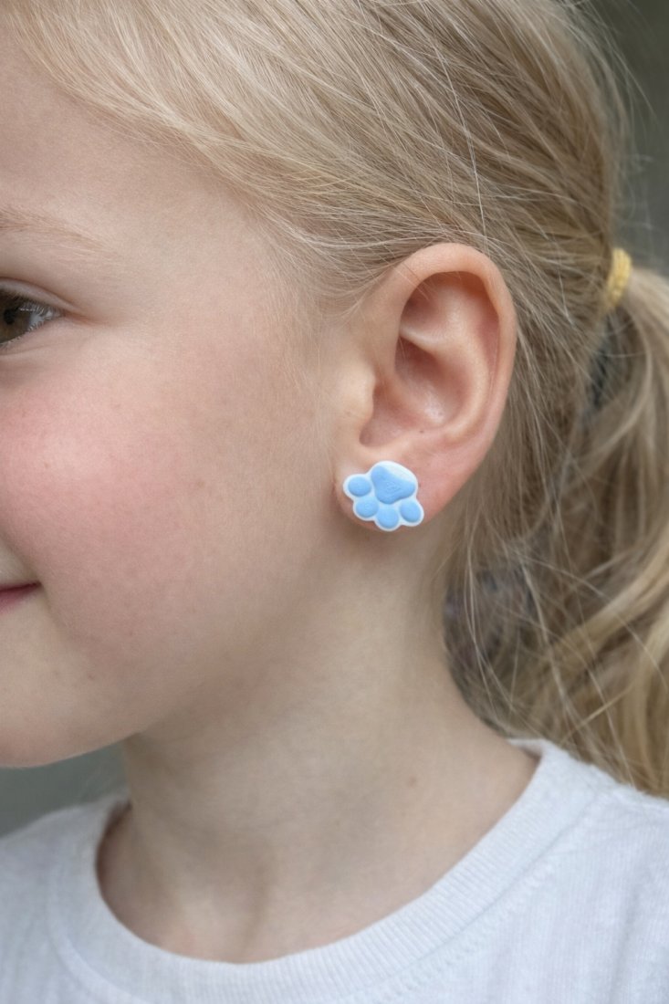 Delikatne kolczyki w kształcie małych błękitnych łapek to idealny dodatek dla dziewczynki, która kocha zwierzątka i lubi słodkie ozdoby.