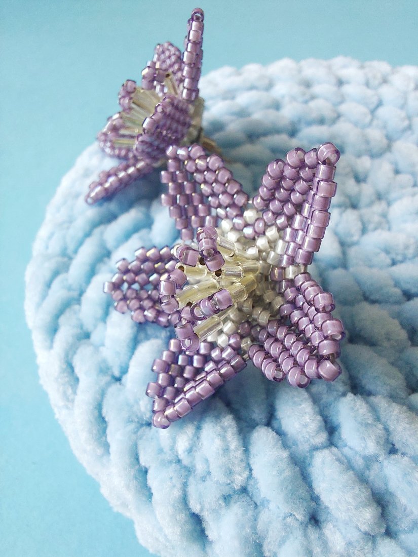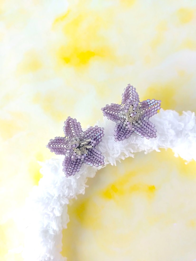 Delikatne i urocze kolczyki w kształcie lawendowych kwiatków, wykonane całkowicie ręcznie z drobnych koralików. Każdy płatek został starannie spleciony, tworząc subtelną, ale wyrazistą formę. To kolczyki typu sztyfty – lekkie, wygodne i pełne wdzięku.