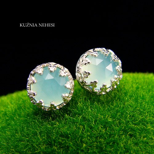 Kolczyki – Lea – niewielkie proste i niezwykle eleganckie. Wykonane własnoręcznie od podstaw ze srebra tradycyjną technika jubilerską oraz błękitnych fasetowanych Chalcedonów ( naturalny kolor ). Średnica kolczyka 10 mm. Jest to typ na sztyfcie zapinany na tzw – baranki. Zapraszam do zakupu pierścienia do kompletu.