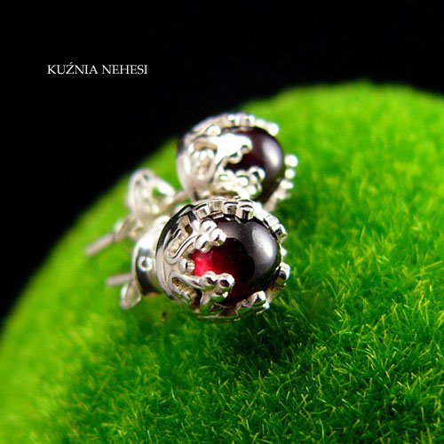 Kolczyki – Lea – maleńkie proste i niezwykle eleganckie. Wykonane własnoręcznie od podstaw ze srebra tradycyjną technika jubilerską oraz naturalnych Granatów. Średnica kolczyka 6,5 mm. Jest to typ na sztyfcie zapinany na tzw – baranki. © Nehesi Design