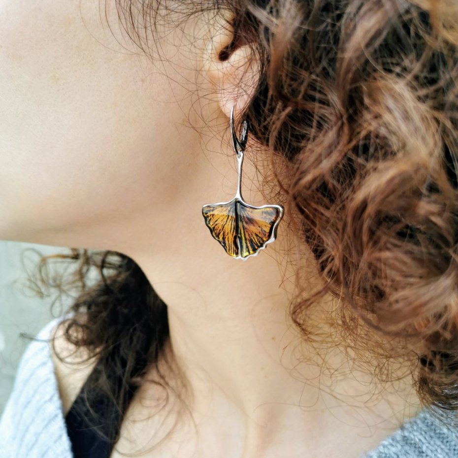 Wspaniałe wiszące kolczyki inspirowane miłorzębem japońskim. Według religii buddyjskiej ta magiczna roślina nosi w sobie symbolikę siły, witalności, nadziei i braterstwa.